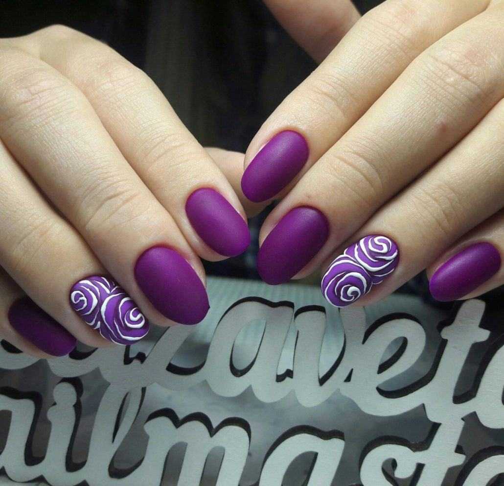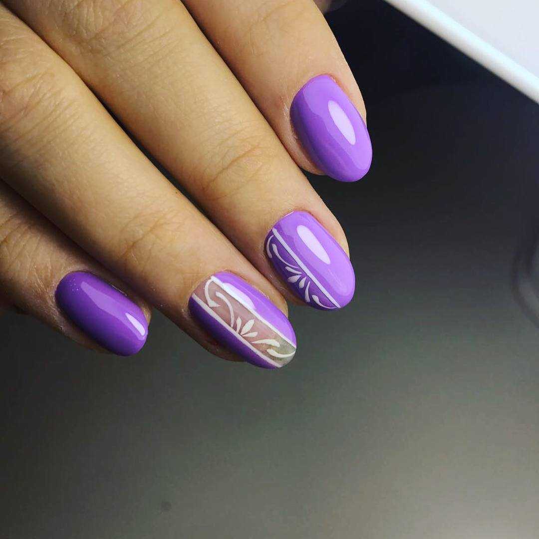 Белый сочетается не абсолютно со всеми тонами сиреневой гаммы. В этот тандем лучше выбирать светлые матовые оттенки фиолетового. Сочетание с белым подойдет для градиента, френча, нежных витиеватых рисунков, геометрии и негативного пространства.