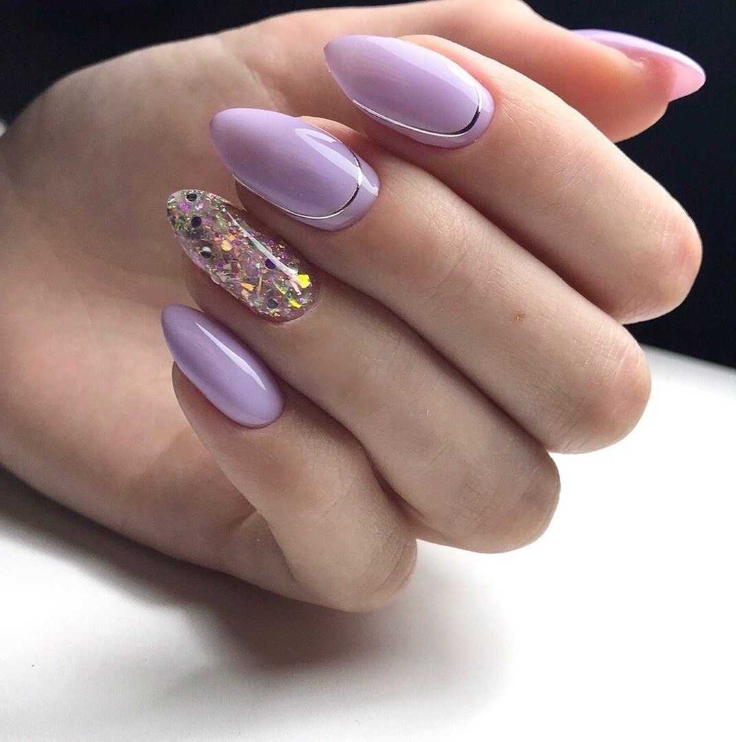Очень элегантный дизайн ногтей, в котором глиттер сочетается с сиреневым гель-лаком. Таким образом, они не привлекают к себе и дизайну слишком много внимания. Также используйте более яркие акценты: серебряные, золотые, розовые блестки и другие блестящие украшения.