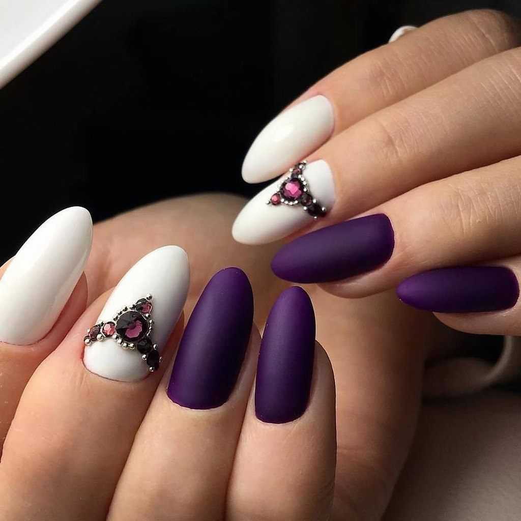 Сочетание белого и фиолетового отлично смотрится с цветочными мотивами, лунным светом и французским дизайном, стильной геометрией и рисунками в технике негативного пространства.