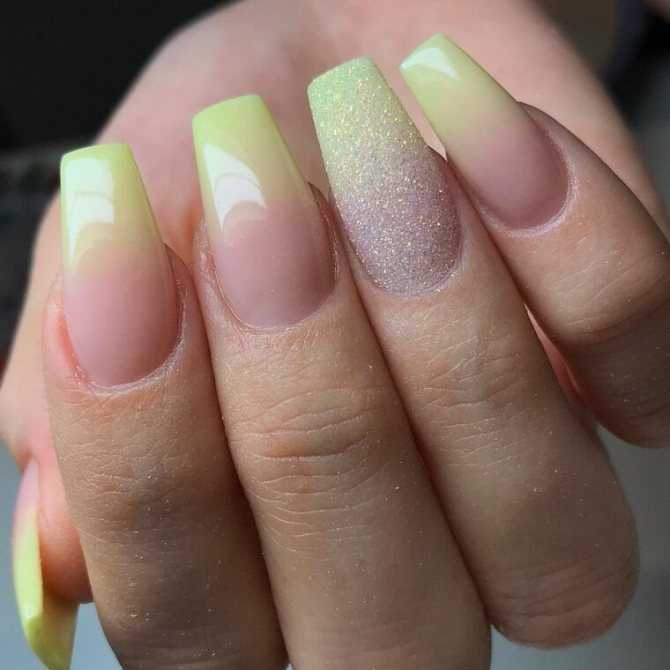 Маникюр с растяжкой представляет из себя плавный переход из одного цвета в другой, хоть и степень плавности может варьироваться.