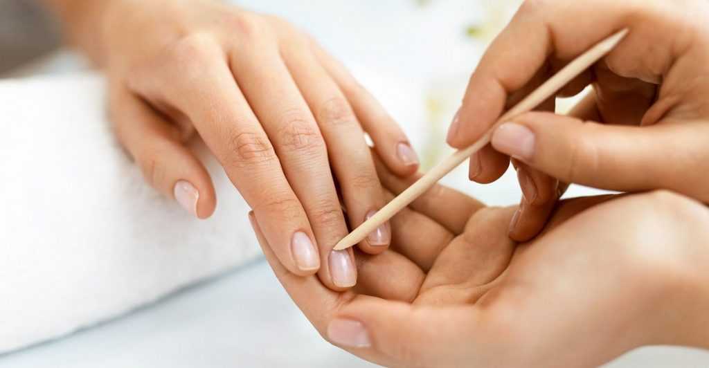 Размоченную кутикулу аккуратно отодвигают деревянной палочкой, либо срезают с помощью щипчиков, специальных ножниц. Поверхность ногтей обезжиривают.