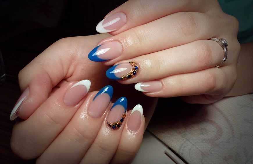 Миндальный френч выглядит очень женственно и утонченно. Для прорисовки линии улыбки нужно использовать тонкую кисть и гель-краску, чтобы линии получились плавными и мягкими. Слегка заостренный, плавно скругленный свободный край ногтя миндалевидной формы подразумевает прорисовку классической линии улыбки – полукруглой. Красиво, когда она дублирует очертания свободного края.