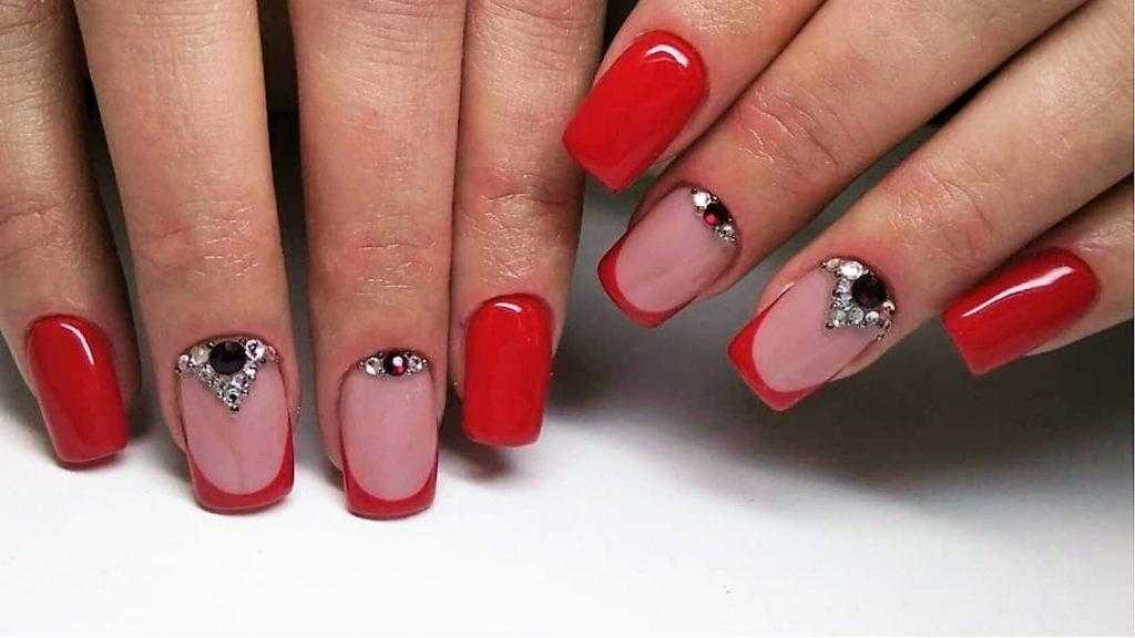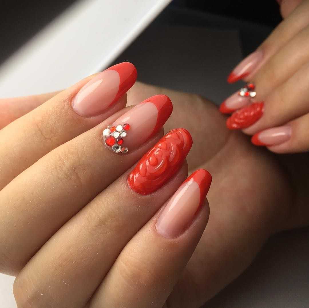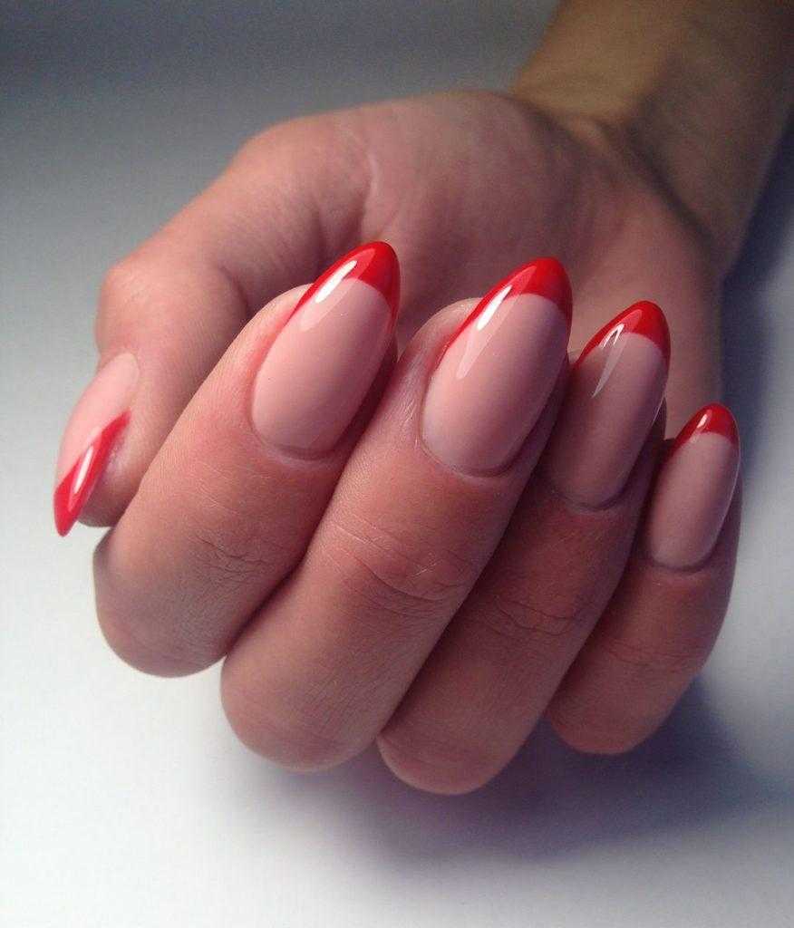 Еще один необычный вариант для создания френча. Это вариант для тех, кто любит красные лаки в маникюре, но не готов делать однотонный сплошной дизайн. Такой френч выглядит необычно и очень стильно. А главное — женственно.