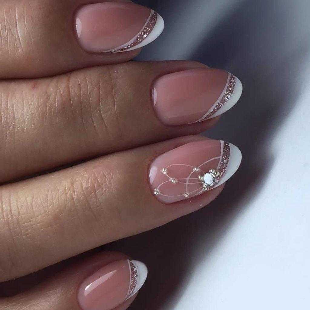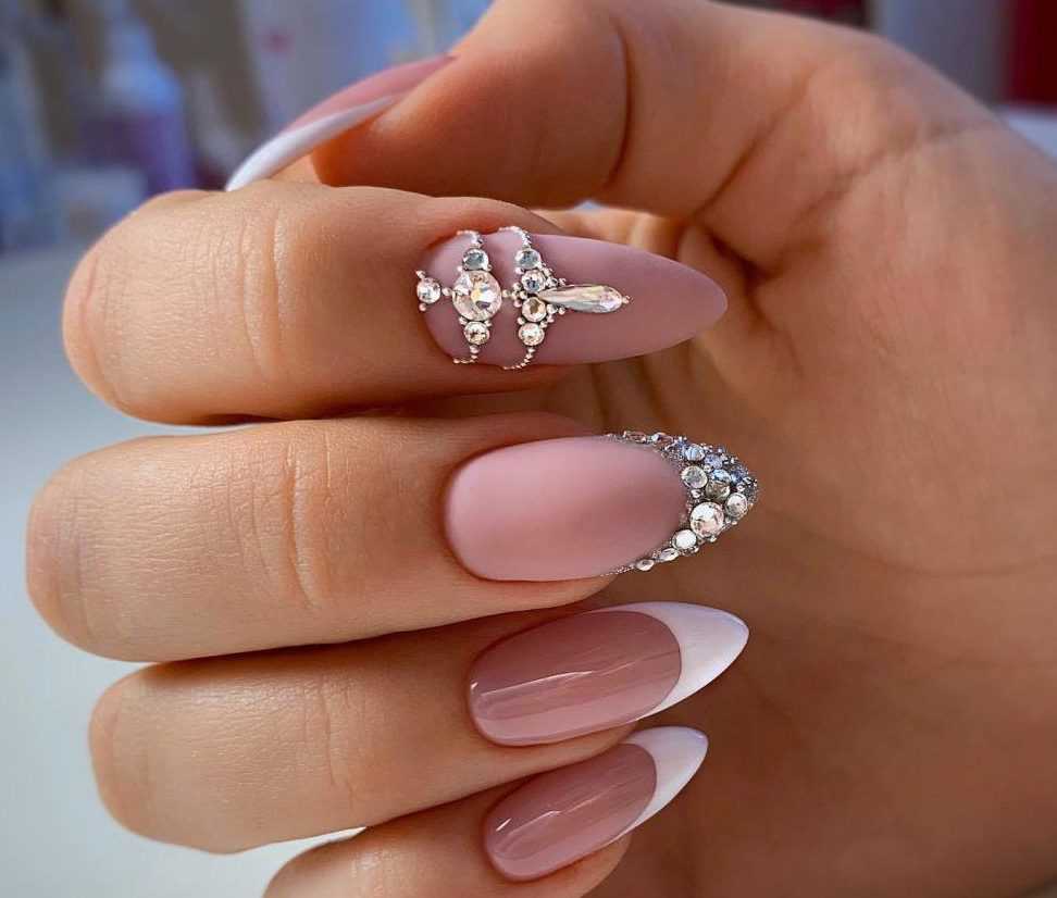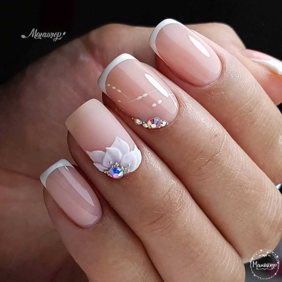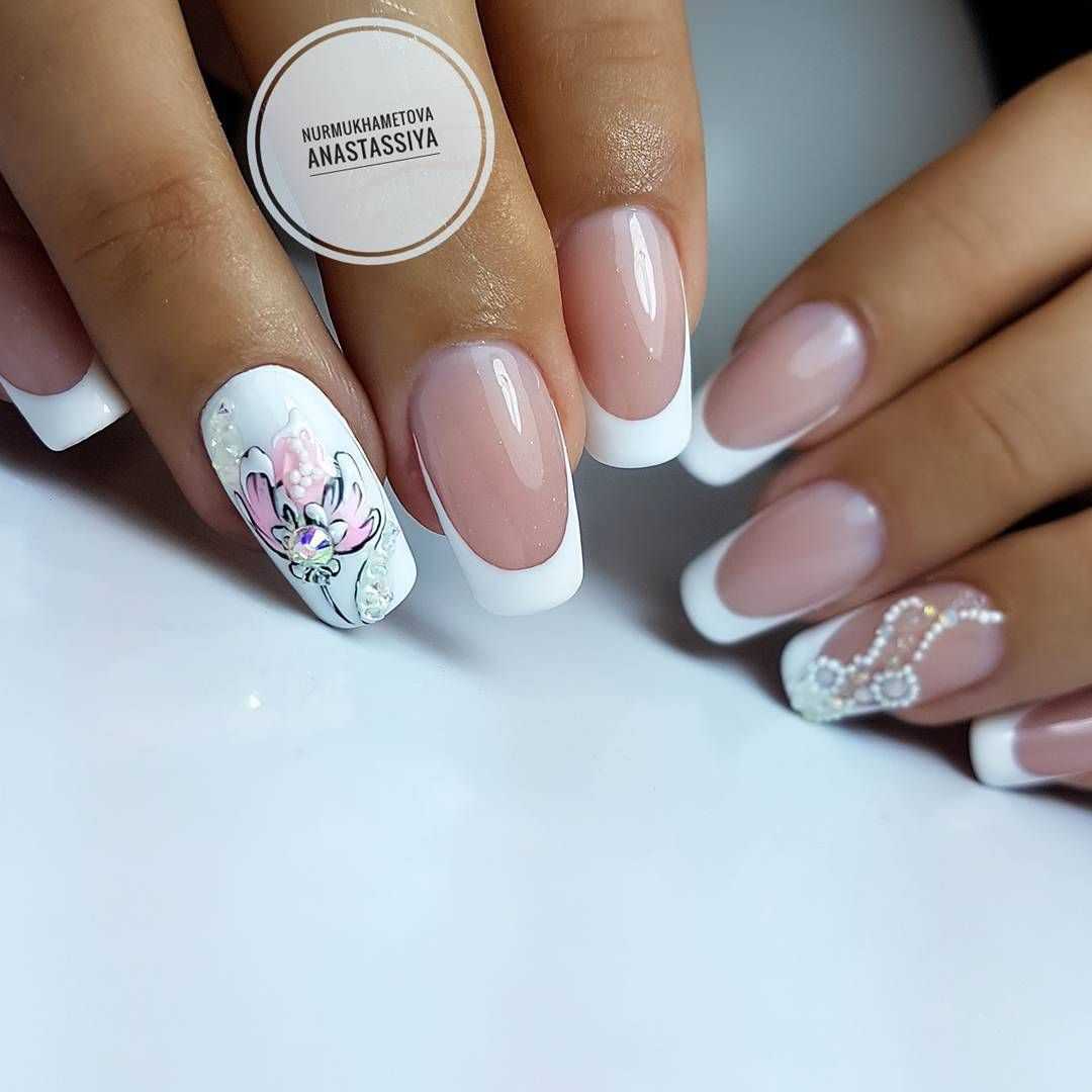 Так, например, довольно востребованным вариантом дизайна френча в сезоне 2023-2024 станет комбинация градиентной техники френча, с плавным переходом от нежно-розовой основы до белого края, с прозрачным объемным узором или инкрустацией камнями.
