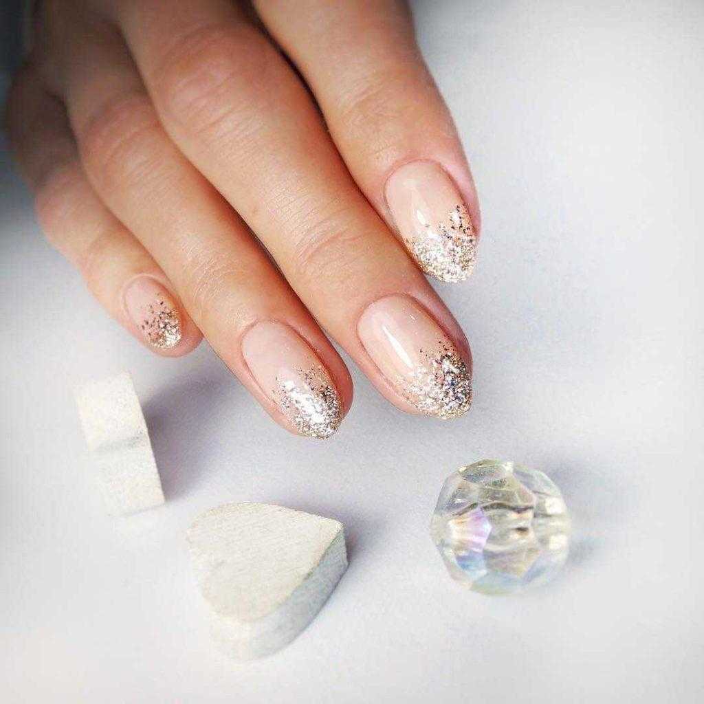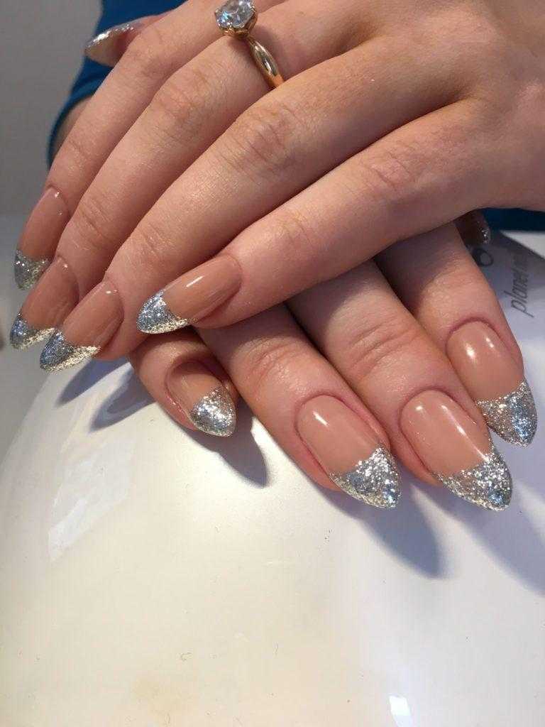Изобилие блесток привело к тому, что с помощью них можно создавать любые маникюры. Нередко мастера прибегают к использованию блесток, вместо обычного лака для выделения зоны улыбки. Это достаточно необычный и очень привлекательный метод создания праздничного и торжественного маникюра.
