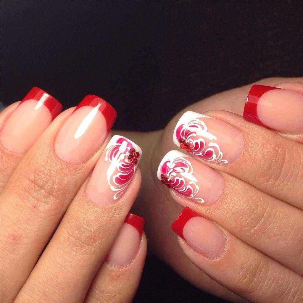 Красный френч или френч с элементами красного создает уникальный дизайн маникюра. Он страстный, яркий и необычайно притягательный. Красный красиво сочетается с черным, белым, золотом, серебром, фиолетовым, желтым и зеленым. Мастера часто используют его для создания рисунков цветов, которые могут быть переходящими.
