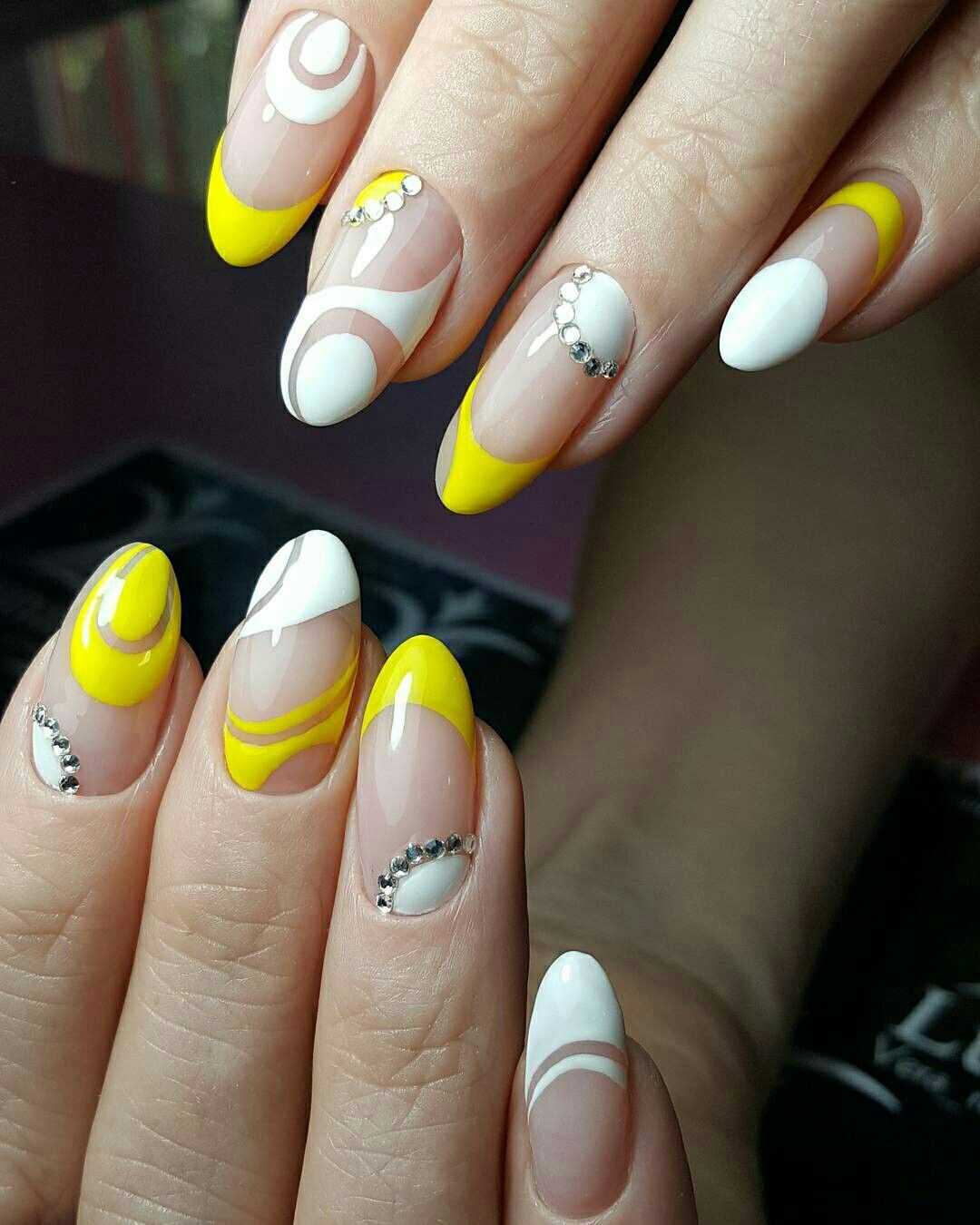 Одна из самых интересных современных тенденций — это разноцветный френч. Это дизайн, когда каждый из ноготков оформляется в свой цвет. Чаще всего такой прием используют летом. Мастера не рекомендуют перегружать такой маникюр другими элементами декора. А для базы стоит выбрать максимально нейтральный оттенок. Например, молочный, нюдовый, любой пастельный. Если хочется добавить декора, рекомендуем выбрать один акцентный палец на руке и нанести на него, например, рисунок стразы.