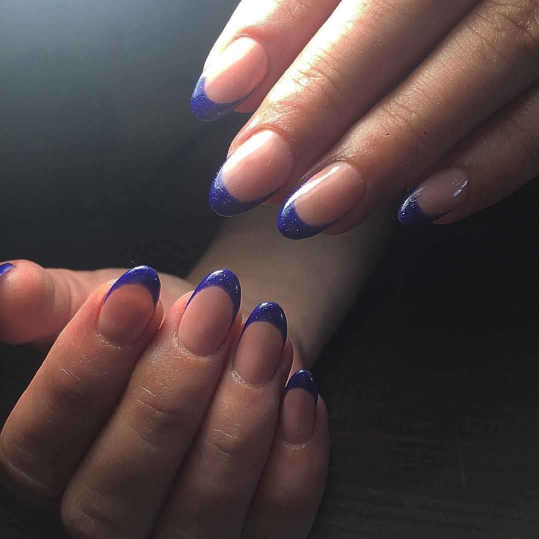 Палитра синего очень богата. От ледяного голубого до практически черного. Вы можете выбрать любой оттенок, все зависит от сезона и уместности маникюра. Например, темно — синий вы можете выбрать на замену черного. А голубой отлично подойдет для создания французского маникюра теплыми летними днями.
