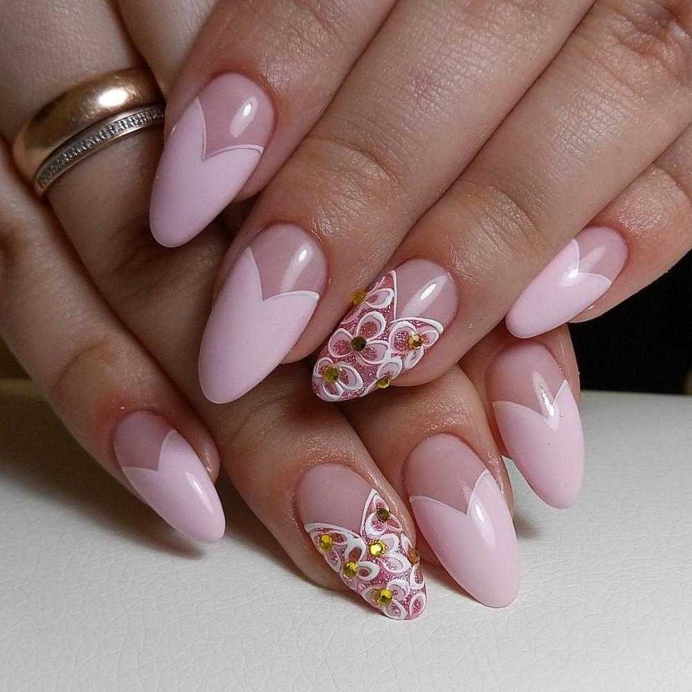 Одним из главных трендов этого года стал V-образный французский маникюр. Такой V-маникюр выгодно отличается необычной формой улыбки, которая визуально удлиняет ноготь. Очень красиво выглядит в дизайне маникюра сочетающиеся по цвету рисунок, узор и улыбка, луна. В зависимости от времени года за окном можно делать символические рисунки на одном или нескольких ногтях френч-маникюра: зимой – снежинки, елки, новогодние игрушки, весной – сезонные цветы и молодую вдохновляющую зелень, летом – море, мультяшки и фруктовые принты, осенью – капельки дождя и необыкновенно красивые разноцветные листья.