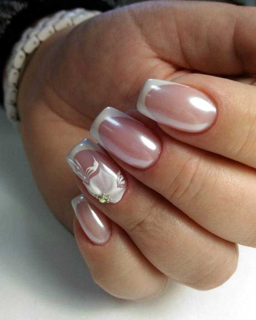 Розовый маникюр с перламутровой пудрой напоминает морской жемчуг. Его часто выполняют в виде лунного дизайна или френча, а один из ногтей декорируют наподобие морской ракушки.