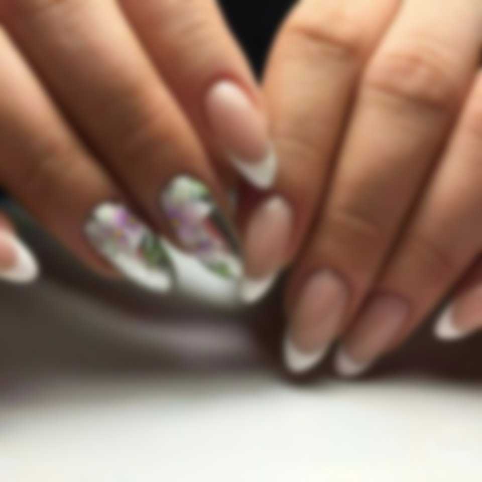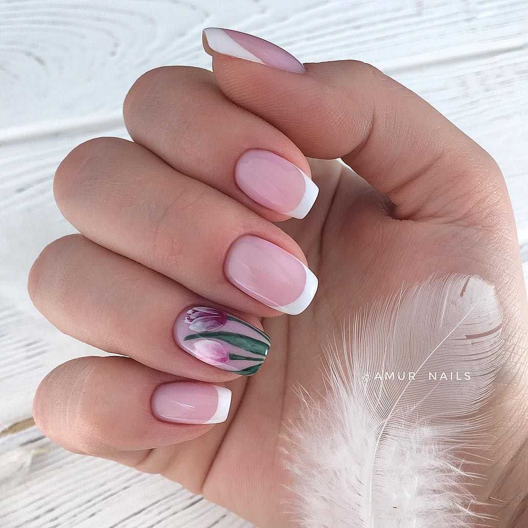 Для лета подходящим принтом станет флористика. Цветы, веточки и листочки будут добавляться на разные техники маникюра. Отлично сочетаются они и с френчем. Флористический принт прекрасно ляжет на овальные ногти или квадратные. Красивым получается дизайн с фиалками на безымянных пальцах. Его можно выполнить весной или в начале лета.