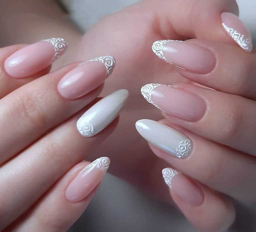 - декорированный. К белому френчу отлично подойдут не стразины и бусины, а пудровое покрытие, или мелкие блёстки;