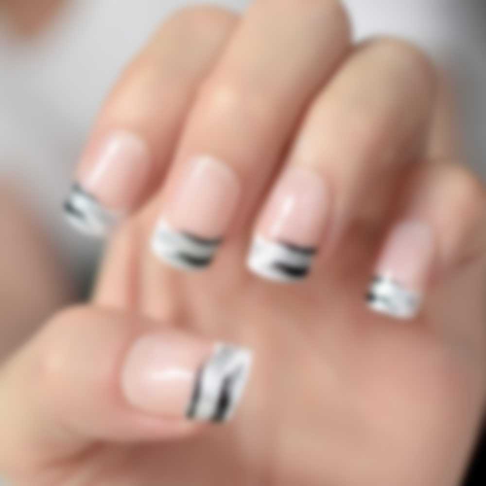 На длинных ногтях можно делать улыбку сложной формы в виде оригинального рисунка (напоминает акварельный узор). Вариант с двойной улыбкой также не менее привлекательный. Белый край отделяется от ногтевой пластины с помощью тонкой серебристой линии.