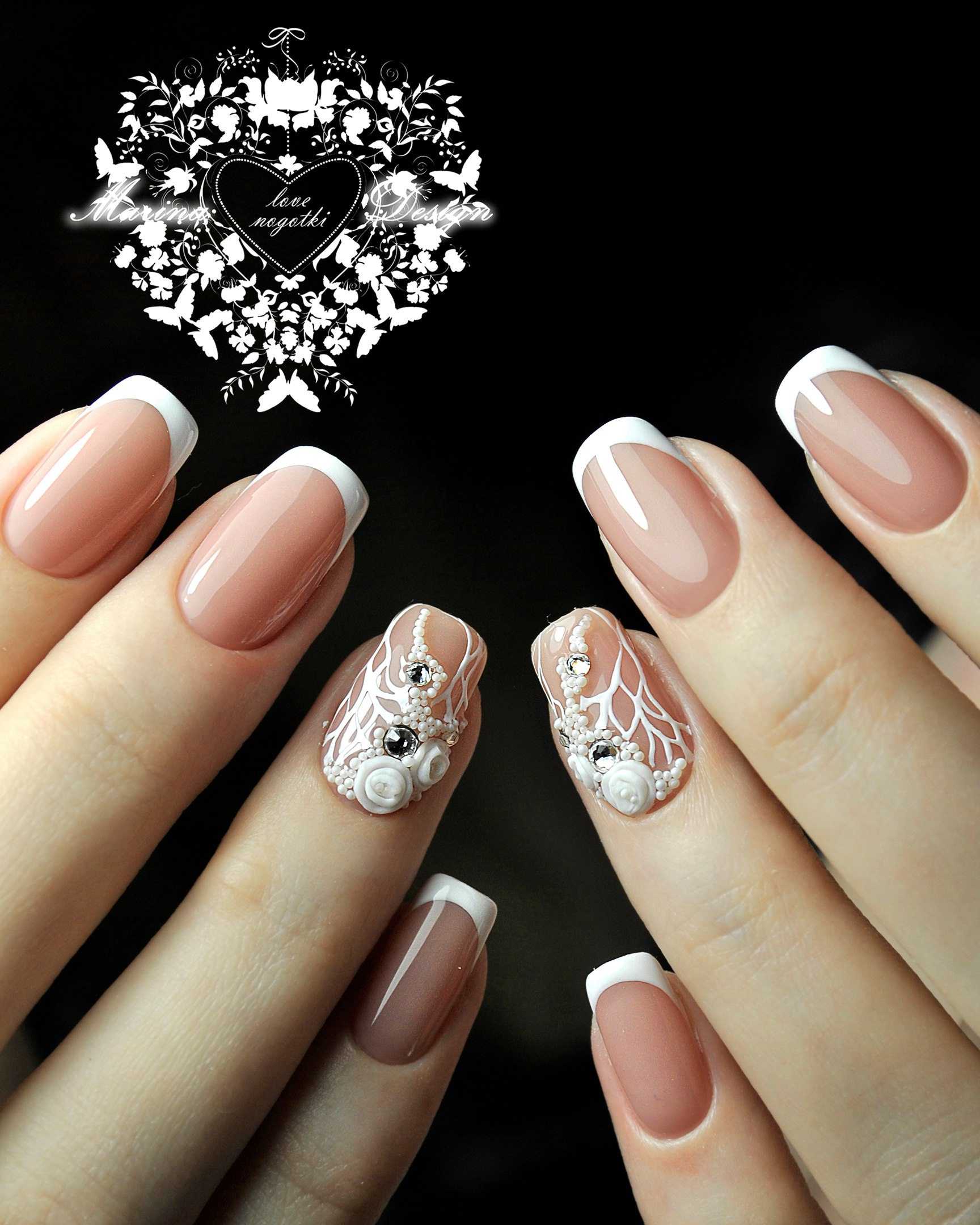 Вторая популярная эволюция френча – это свадебные дизайны, которые выполняются преимущественно в белом цвете – как правило, с нюдовой основой.