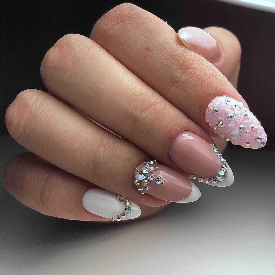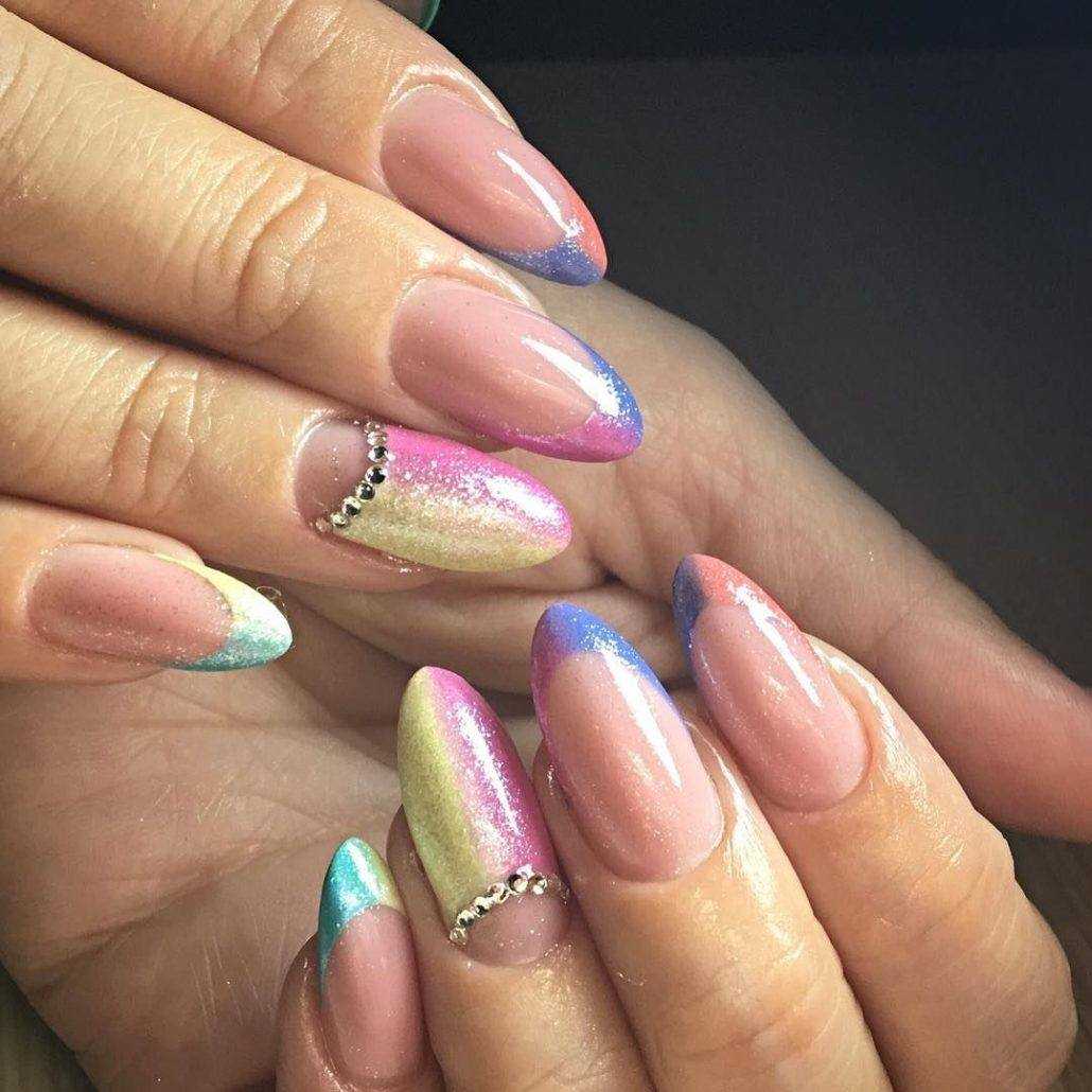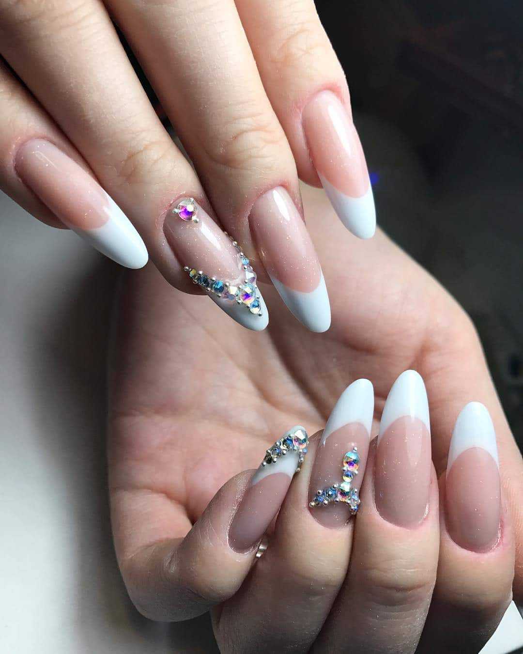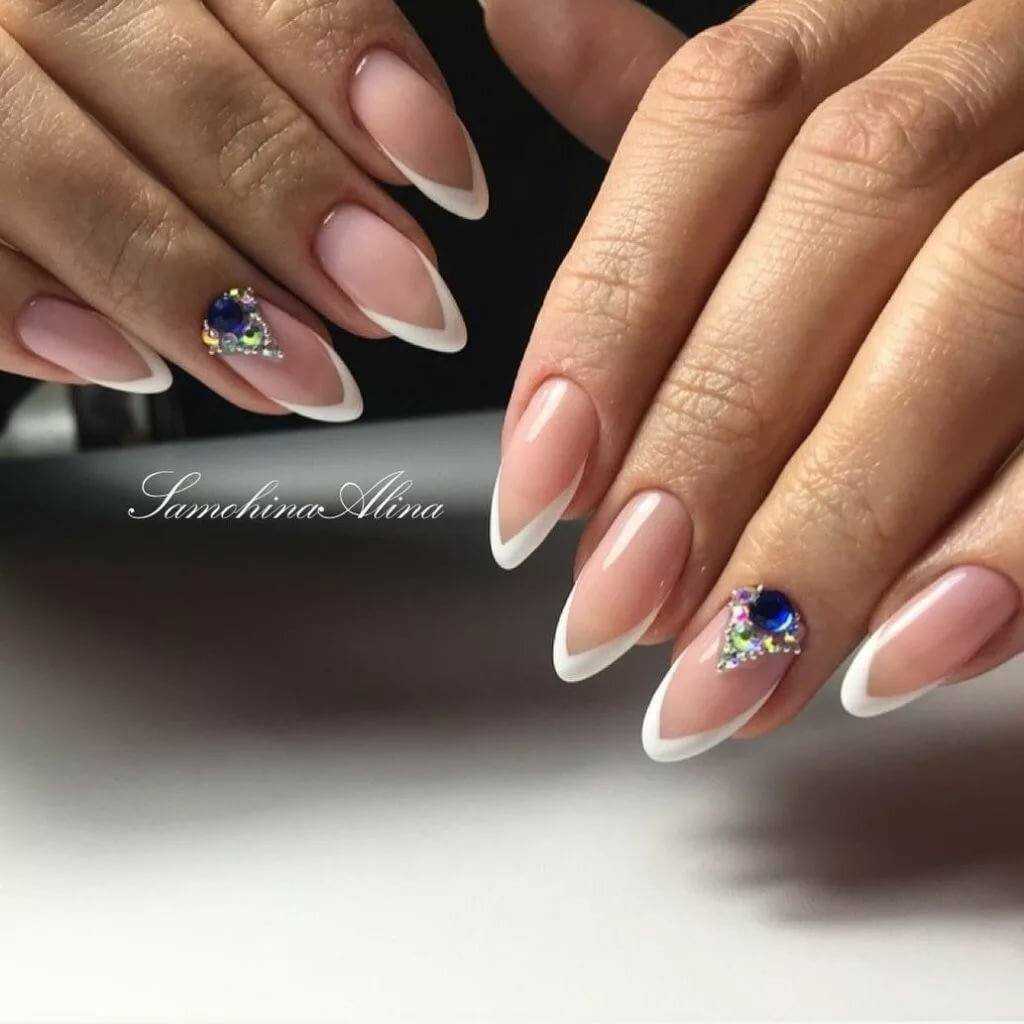 А вот миндалевидные ноготки всегда прибавляют пальчикам длины. В этом случае вы можете экспериментировать с различными трендами, формами и цветом френча.