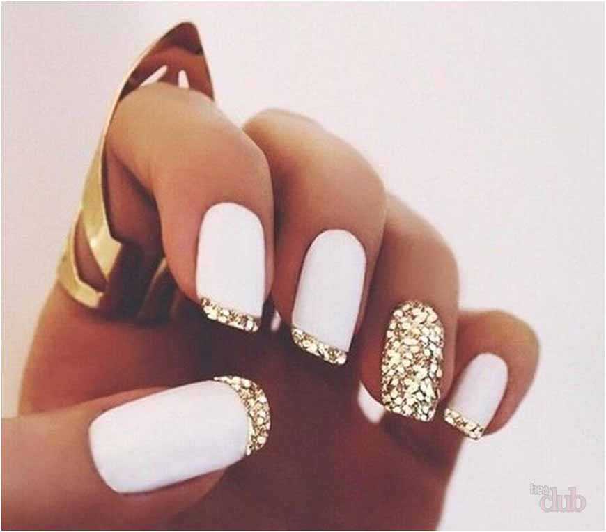Красивый белый маникюр с блестками и надписями.