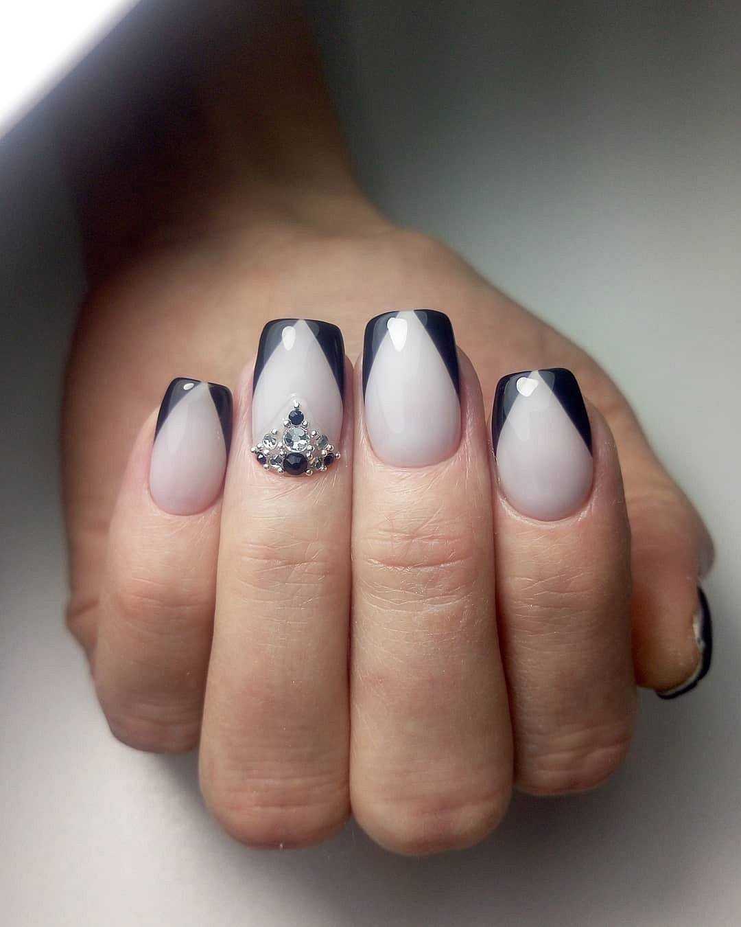 Как уже отмечалось выше, изменению во френче подверглась не только цветовая палитра, но и сама форма «улыбки». Одним из самых популярных вариантов френча считается треугольный. Такой дизайн особенно привлекательно смотрится на квадратных ногтях.
