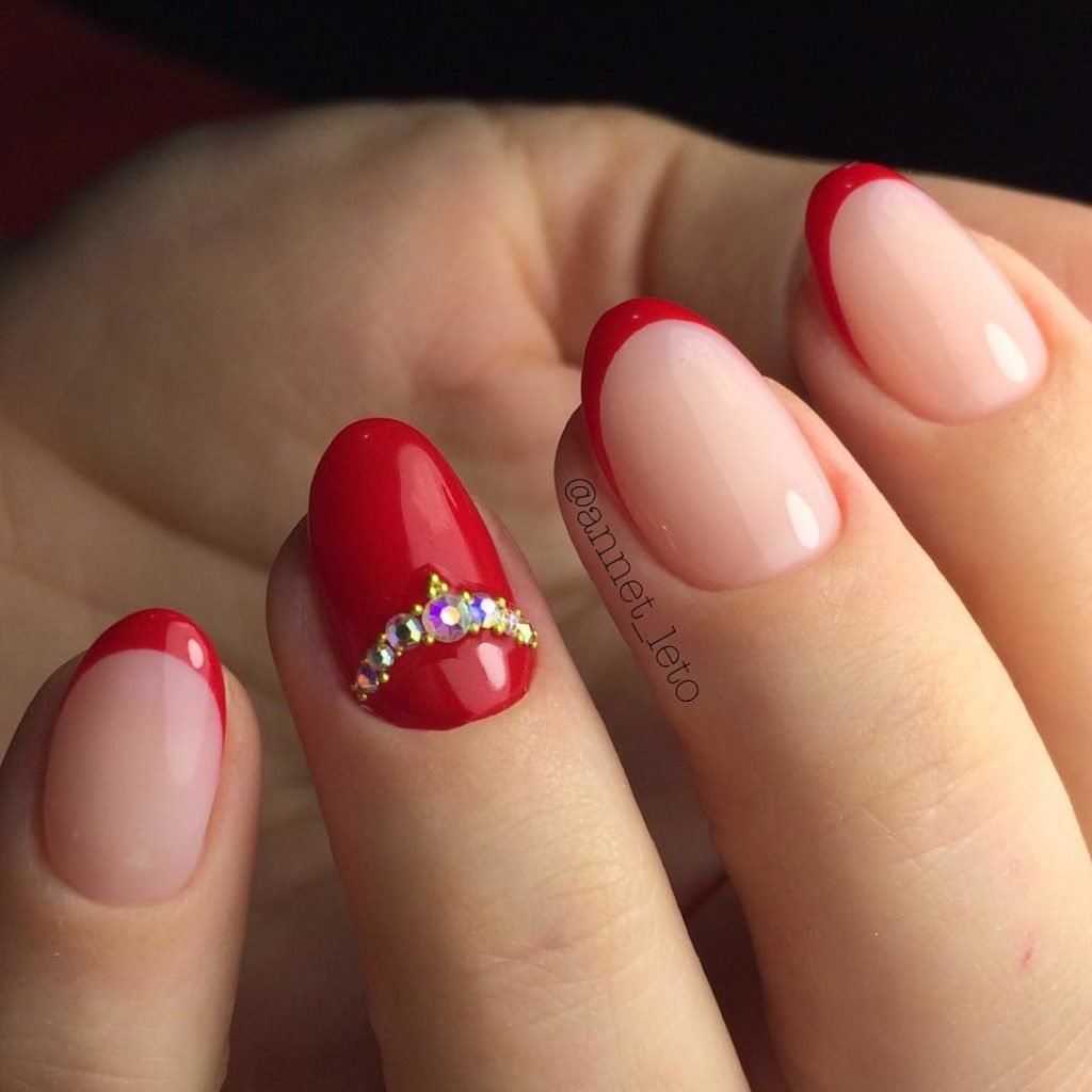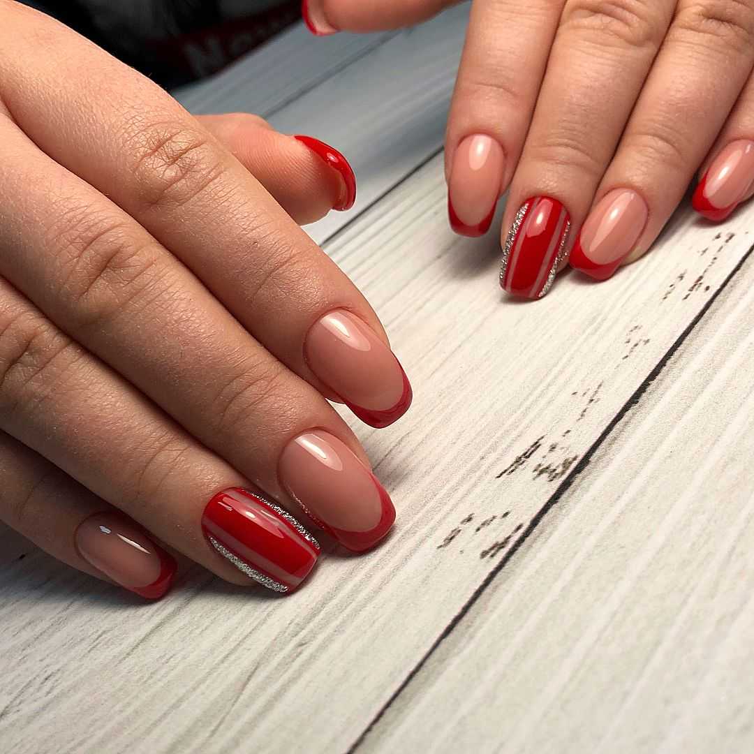 Еще маникюр нюд отлично сочетается с серым и красным лаком. В сочетании с серым лаком бежевые ногти выглядят сдержанно и благородно. Бежево-красный маникюр смотрится красиво с косым френчем и блестками.