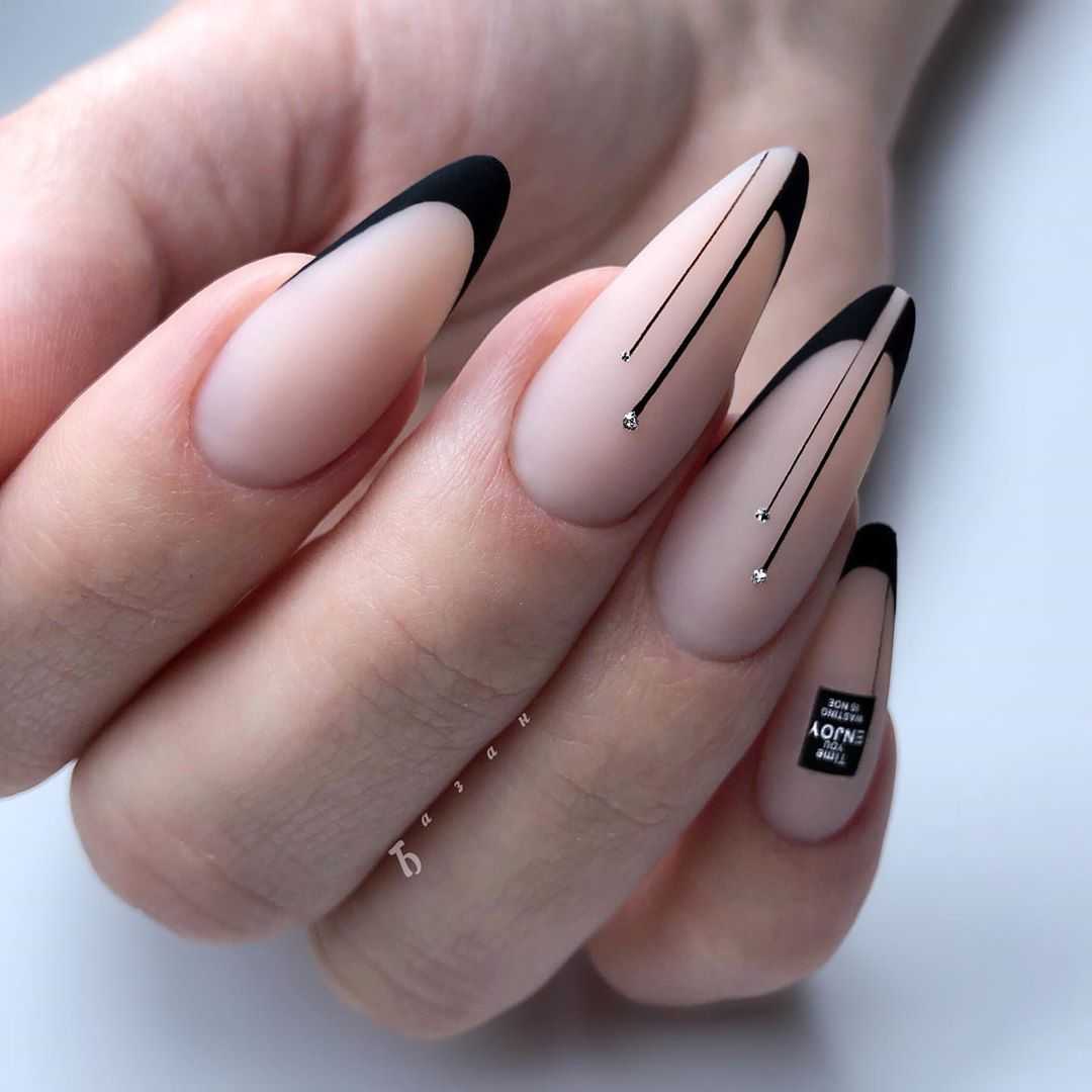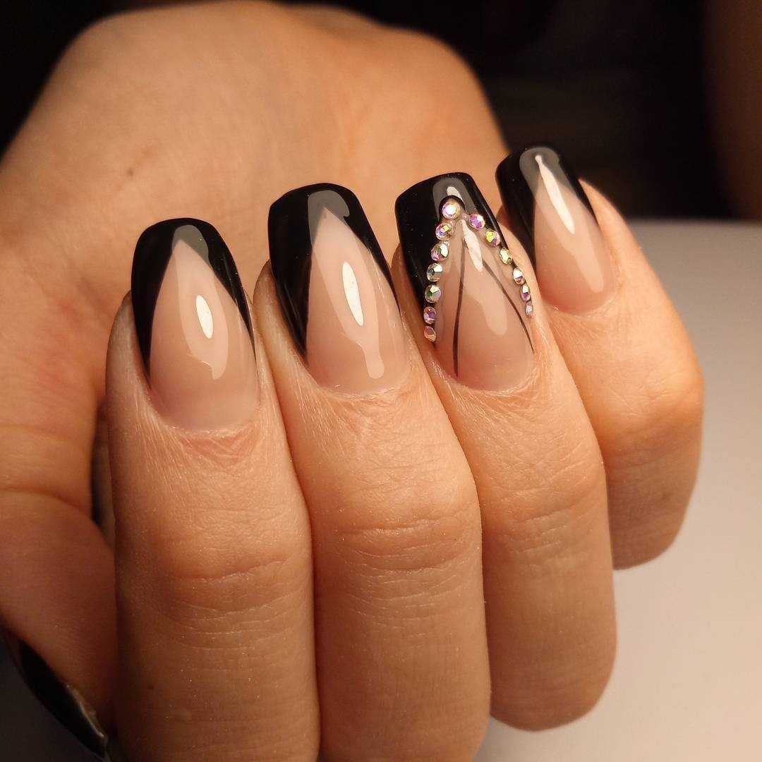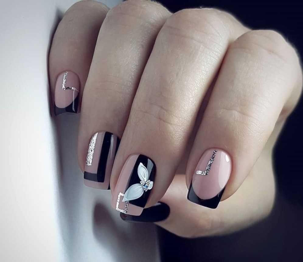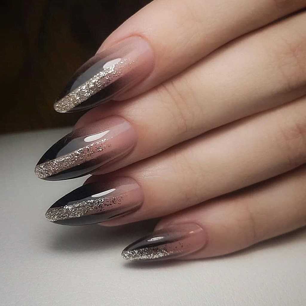 Стильный маникюр на ногтях с блестками, черный гель-лак, бежевый лак.