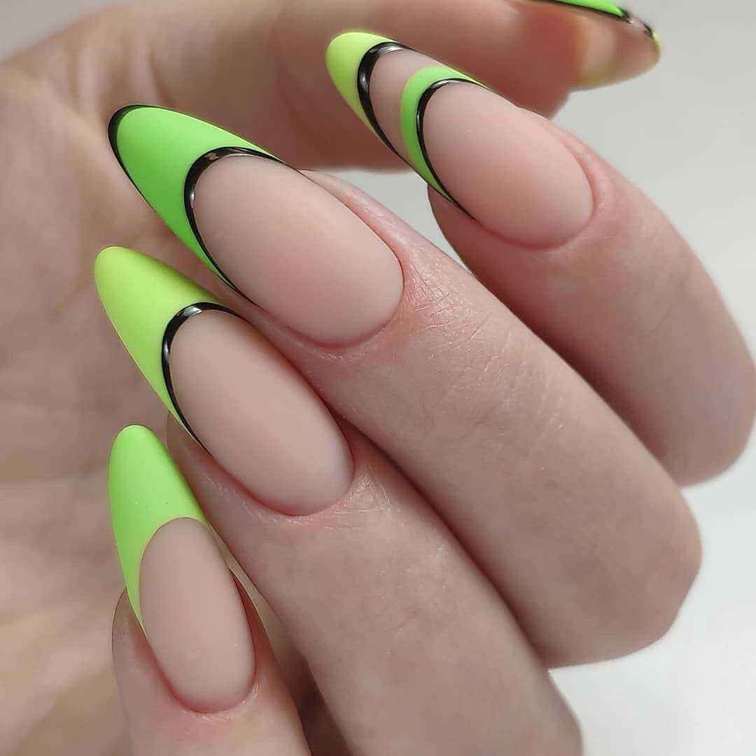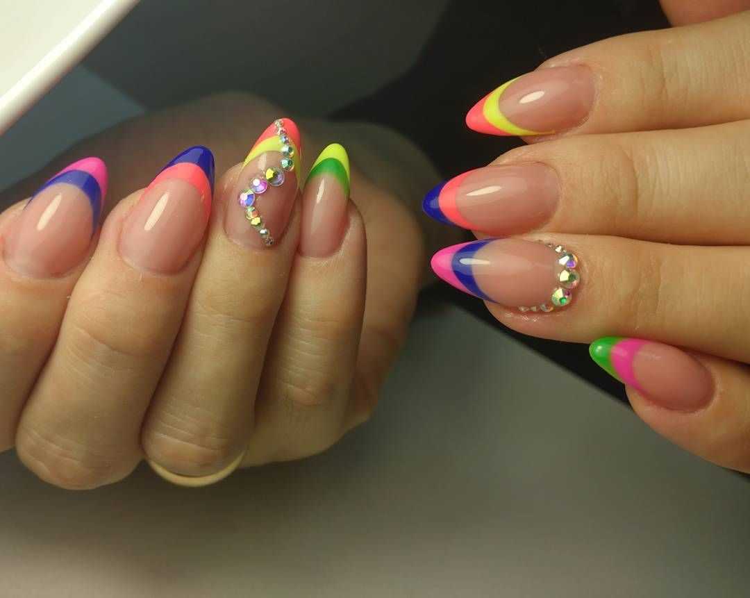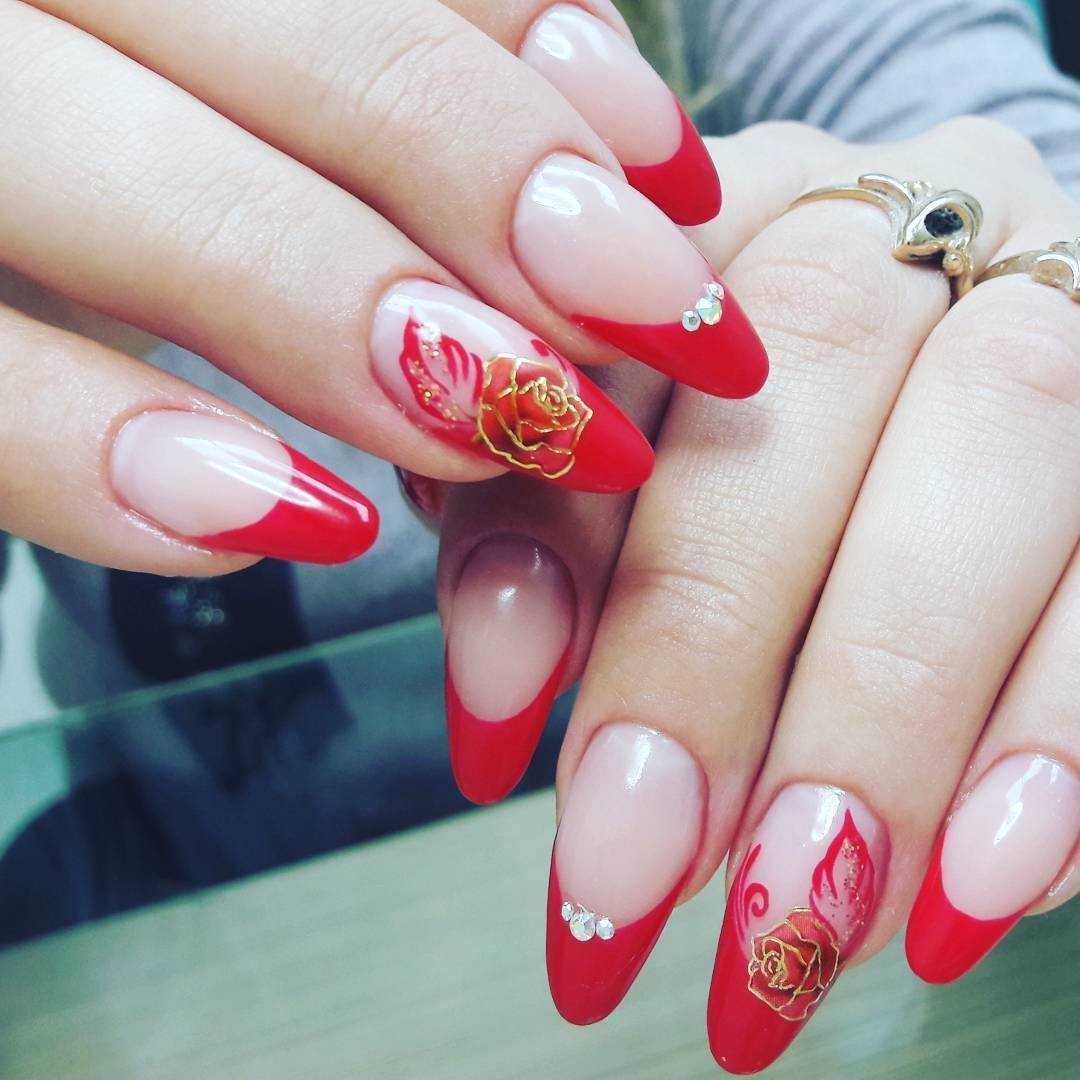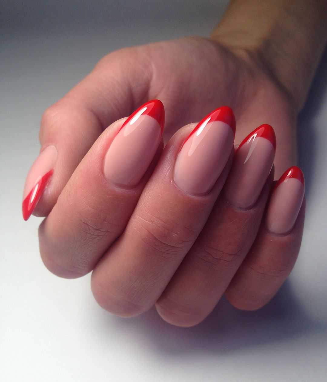 | Острые ногти или ногти миндалевидной формы | При острой форме ногтевого края даже недостаток длины не является противопоказанием для французского метода. Главное – не использовать яркие оттенки, так как они оптически “съедают” базовый шеллак и выглядят некрасиво. |