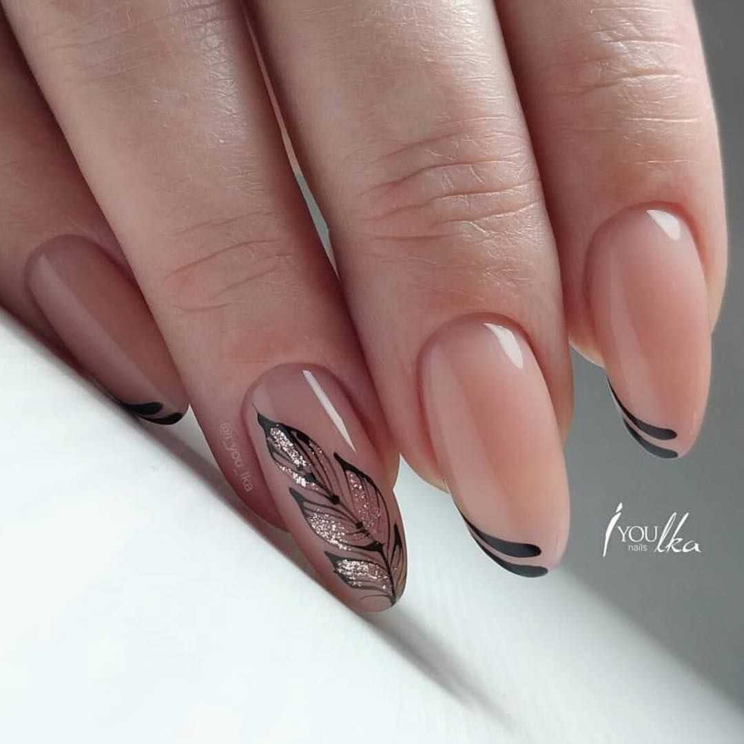 Можно украсить бежевый маникюр черным рисунком на одном ногте, а остальные оставить однотонными.