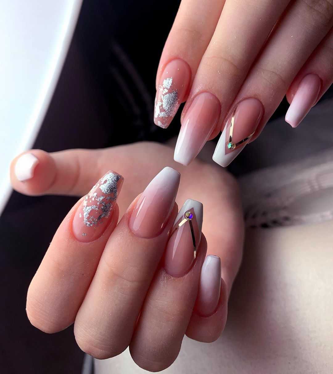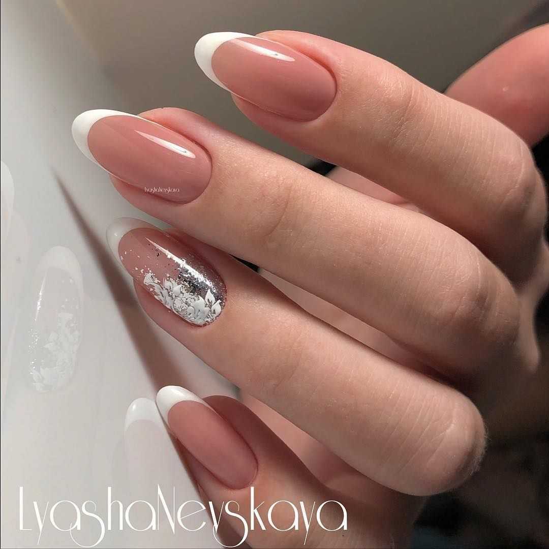 красивый нежный маникюр с серебряной фальгой.