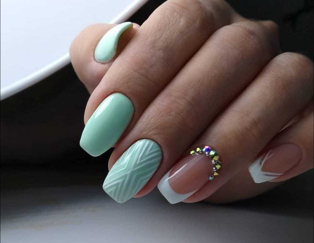Бежево-мятный маникюр на ногтях выглядит очень мило и нежно. В первом случае ногтевая пластина разделена телесным и мятным цветом и серебристой полоской. Во втором случае ногти украшены горошком, зигзагами и блестками.
