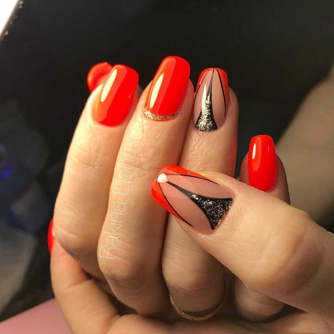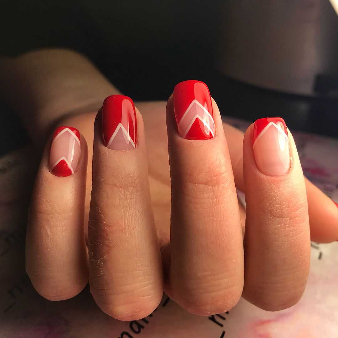 Роскошно смотрятся на ногтях геометрические орнаменты. Это и треугольные лунки и френч (фото 1), и нарисованные полосы и обводка (фото 2), и разделение ногтей цветом и лентой для дизайна (фото 3), и нарисованные мелкие орнаменты (фото 4).