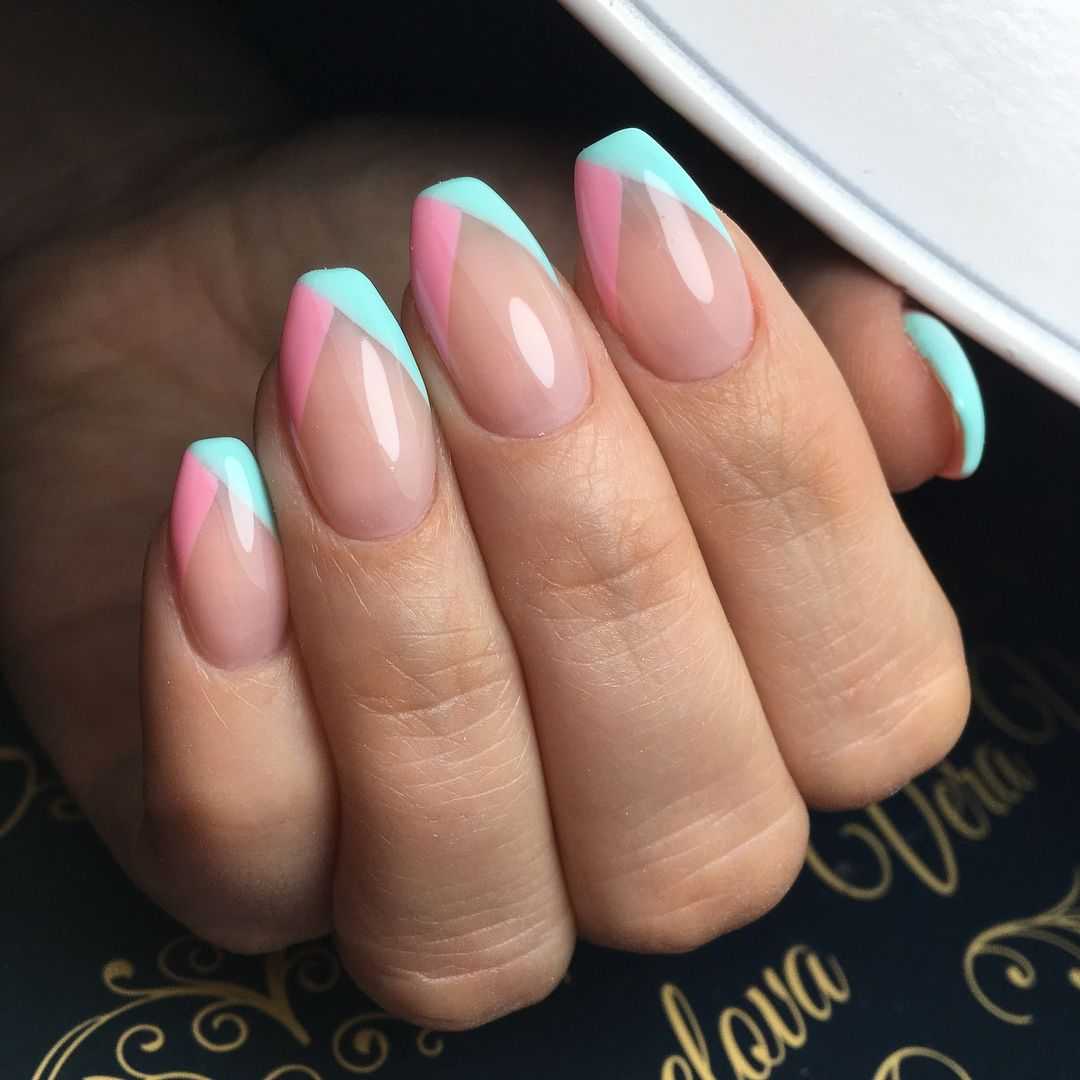 Треугольный френч можно создавать в однотонном варианте, например, белом, розовом, или выполнить твист-маникюр, в котором присутствуют сразу несколько цветов