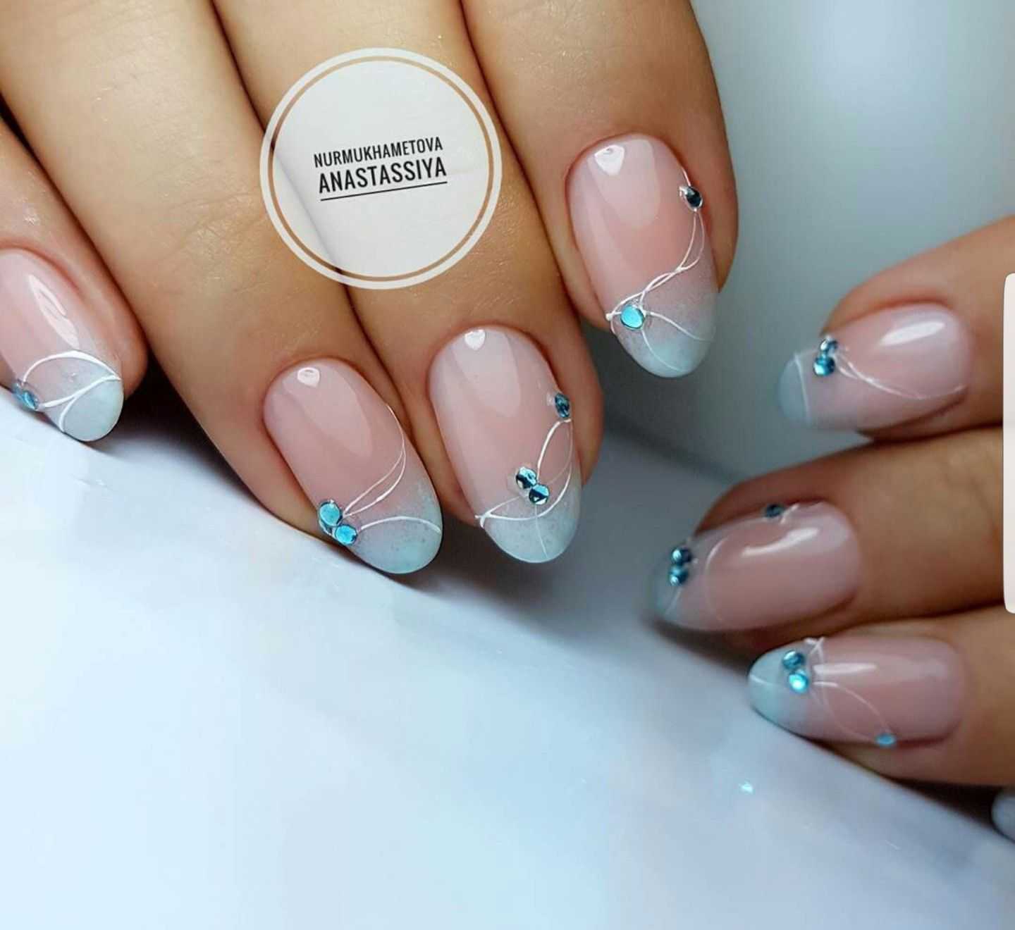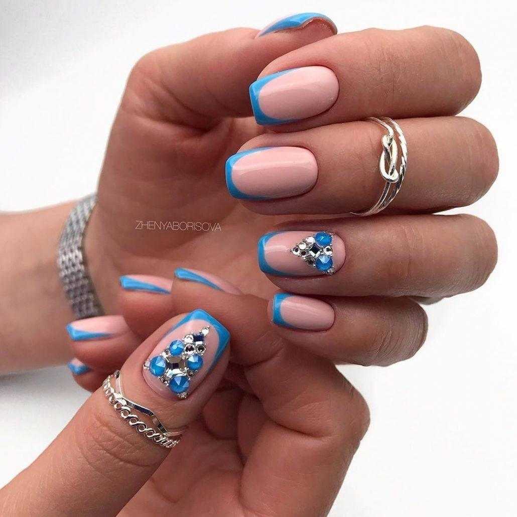 Бежевый маникюр с синим лаком отлично смотрится со стразами на длинных ногтях. Несколько ногтей делаем телесного цвета, а другие синего. Дальше клеим камушки россыпью или складываем их в линию.