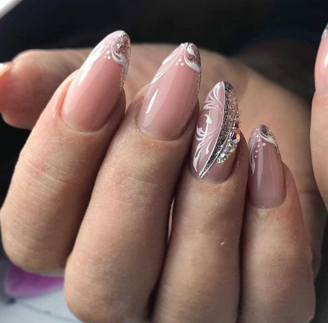 Очень красивое и нежное сочетание это розово-бежевый маникюр. Очень часто он украшается стразами, блестками, а также различными рисунками, например, цветами, точками, полосками, кляксами.