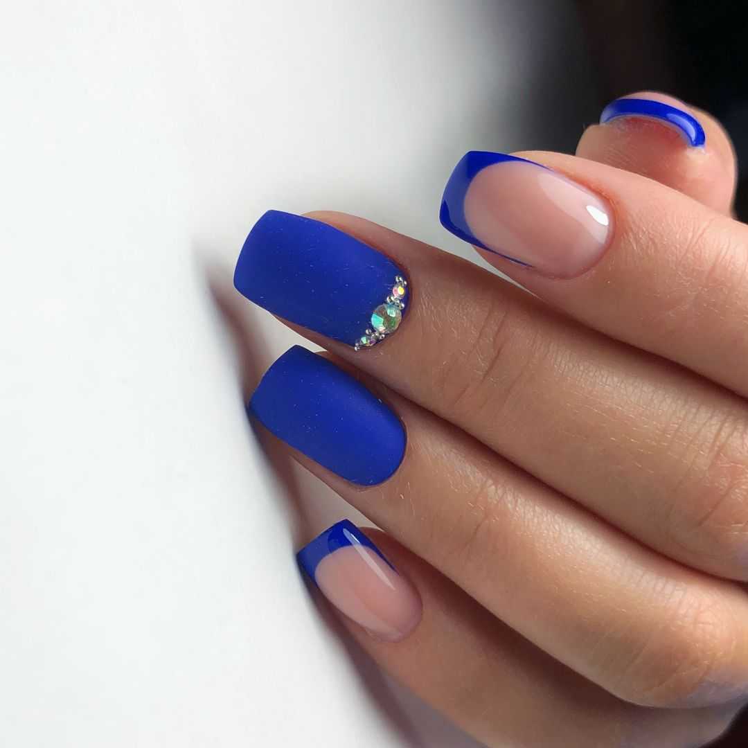 Маникюр на квадратные ногти цветной френч синий цвет.
