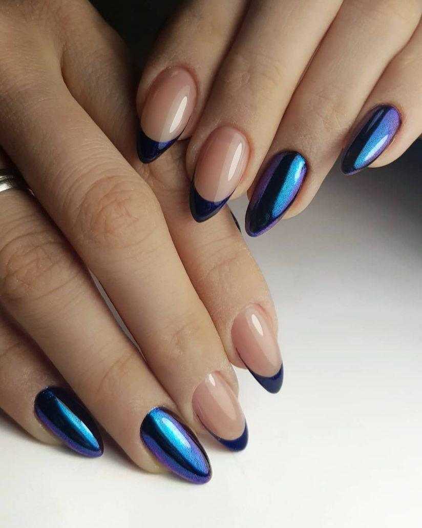 Модный интересный маникюр черный голубой гель лак.