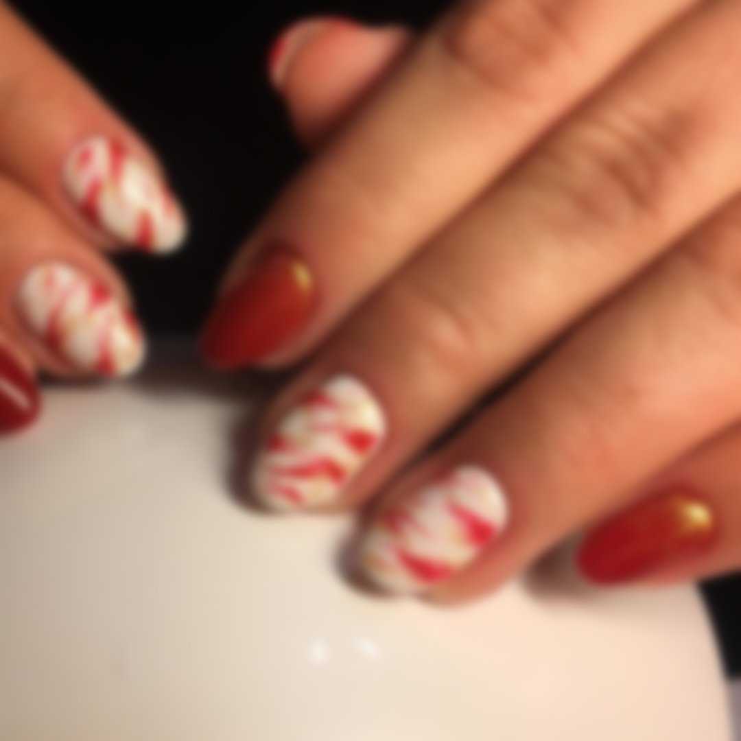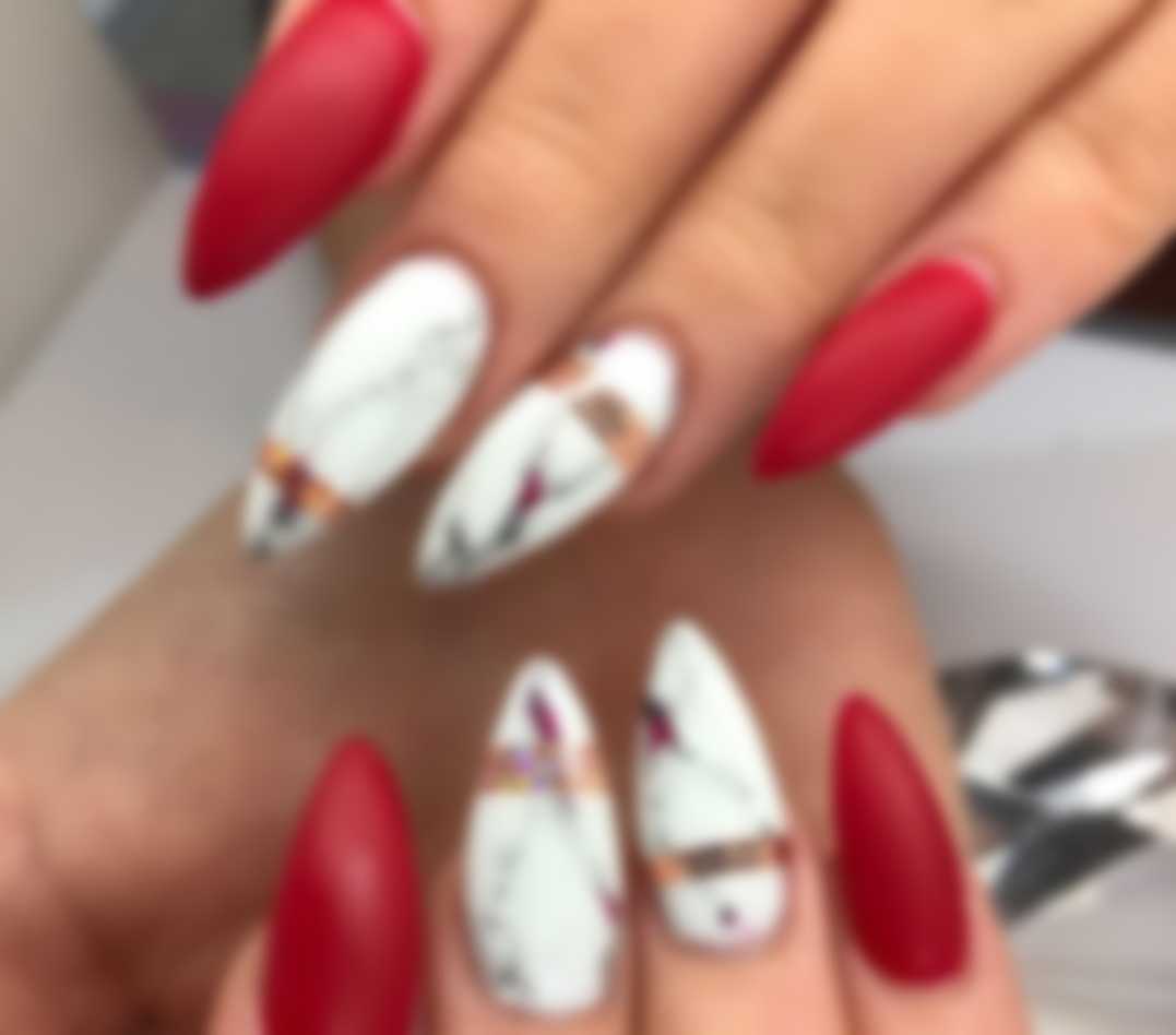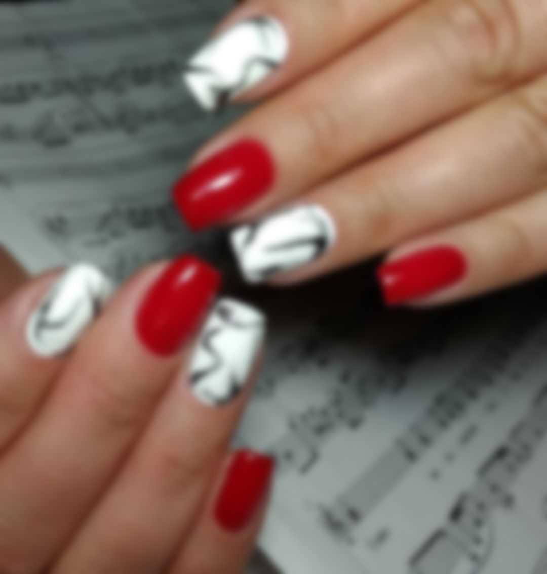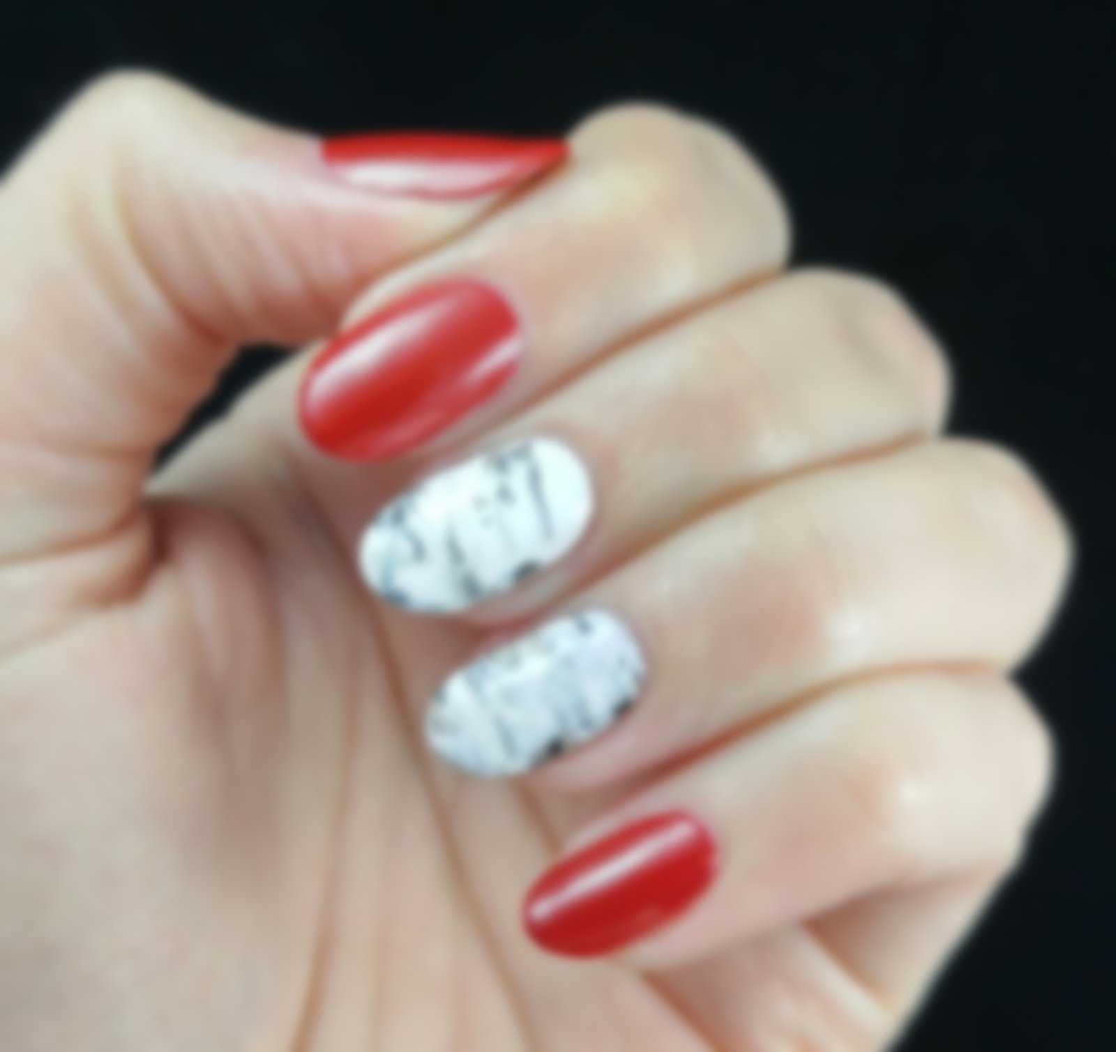 Мраморный дизайн красных ногтей
