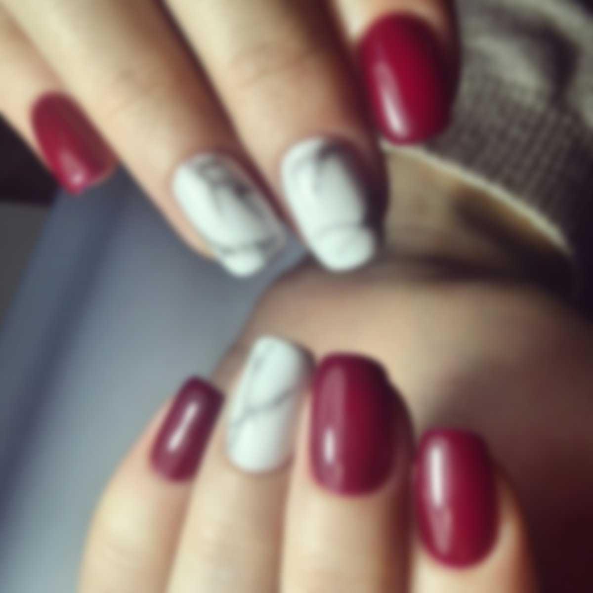 Такой дизайн обычно выполняется в «холодных» оттенках: белом, сером, черном, жемчужном. Сочетание нескольких ногтей, покрытых в стиле мраморного узора, и насыщенно красного цвета на остальных ногтях сделает нейл-арт броским и стильным. Плюс такого дизайна в том, что при всей своей выразительности и привлекательности он достаточно лаконичный.