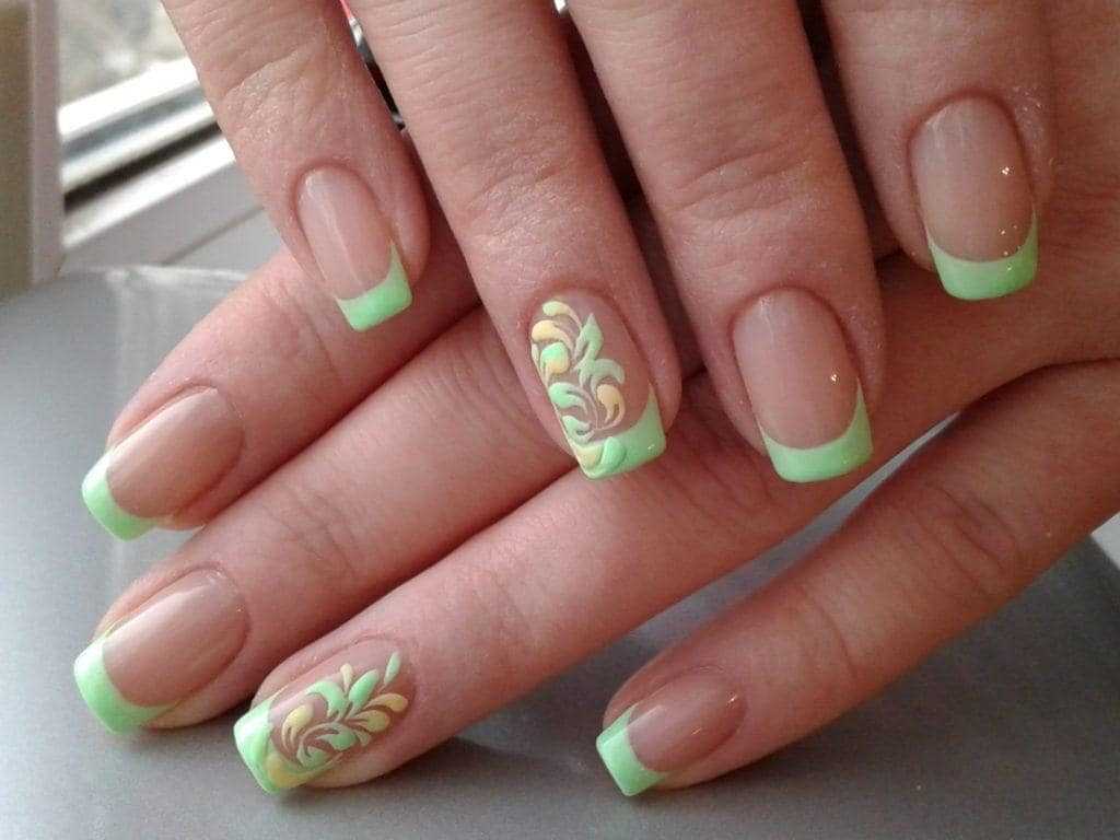 Наиболее актуальным является маникюр в зеленом цвете, полоска которого покрыта принтом цветочков. Сразу появляются ассоциации с весенней погодой и является шикарным дополнением для летнего образа. А если добавить стразы или блестки, то будет маникюр для вечернего наряда. Цветы не надо делать на всех ноготках, можно сделать через один.