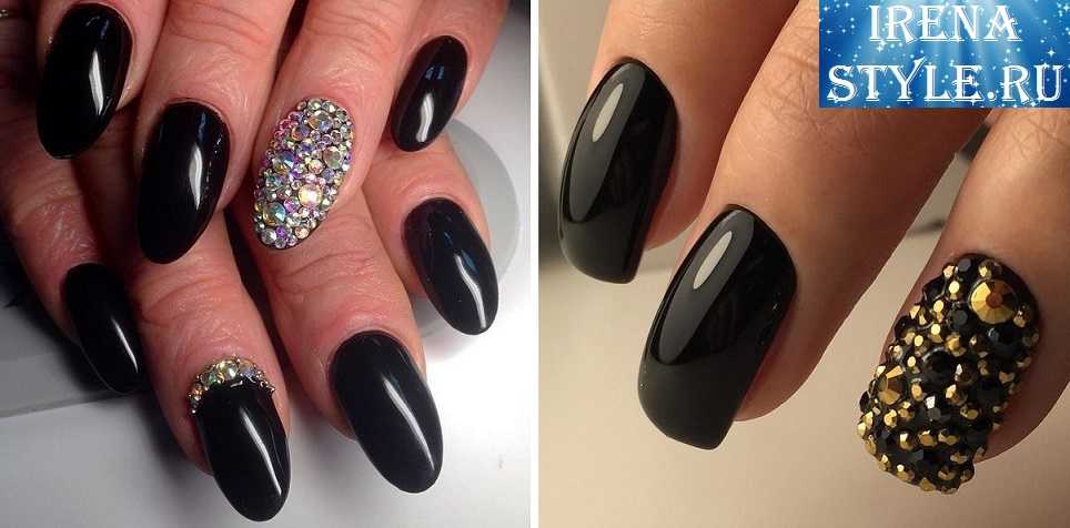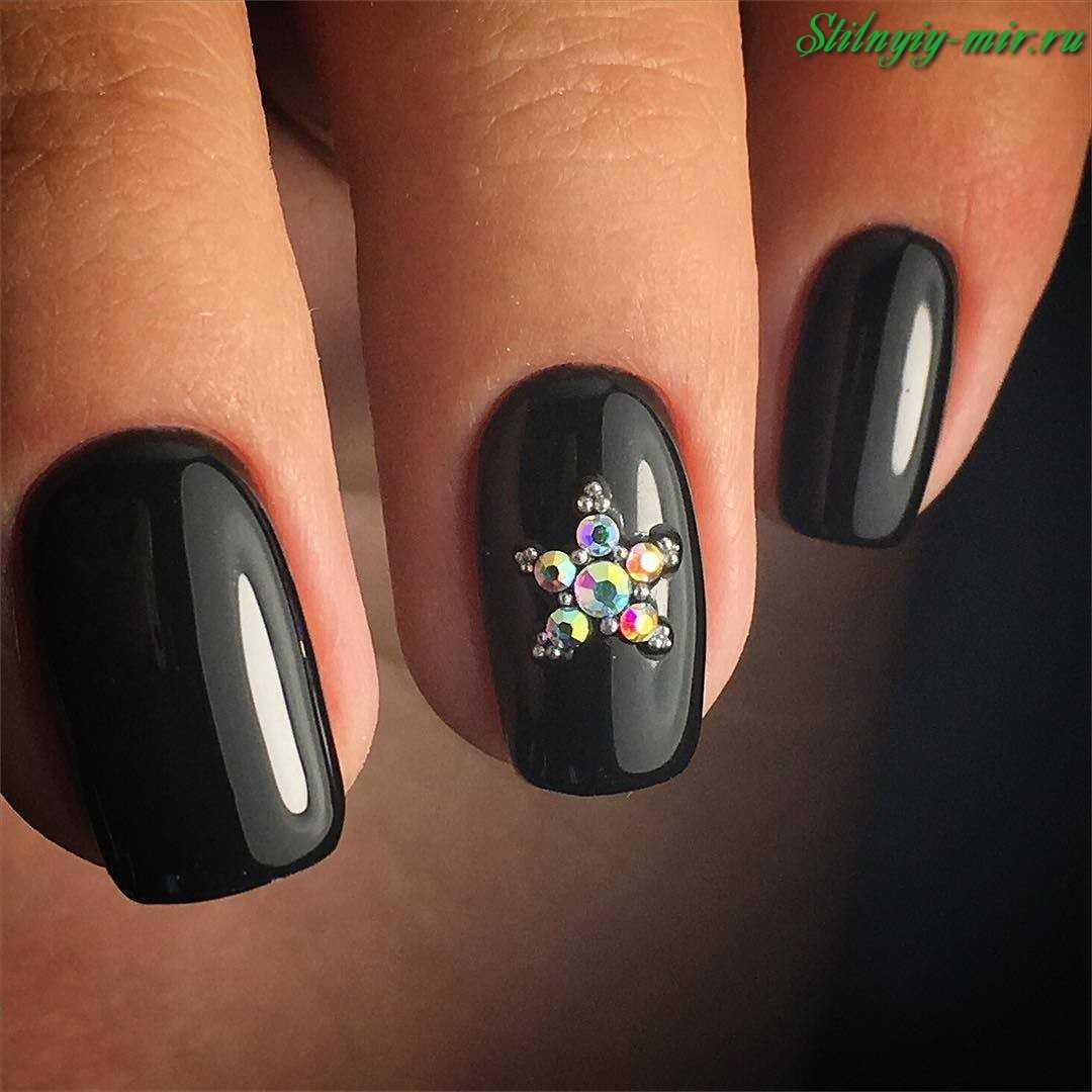 Маникюр со стразами смотрится шикарно. Этот ногтевой дизайн представляет собой целое искусство и не меньшее искусство носить его невредимым. Задумав такое покрытие, следует понимать, что многие дела отойдут на второй план из-за дискомфорта, которые создадут стразы. Черный маникюр со стразами предназначается для особых случаев. К блистательному оформлению гармонично подбирается стиль одежды. Стразы наносятся на свои и на нарощенные формы ногтей. Чем короче форма пластины, тем миниатюрнее должны быть кристаллики. Стразы крепятся клеем на прокрашенную ногтевую поверхность. Порядок расположения украшения зависит от рисунка, будь то геометрический рисунок или стандартная окантовка лунки. В конце маникюрного процесса, поверхность покрывается закрепителем.