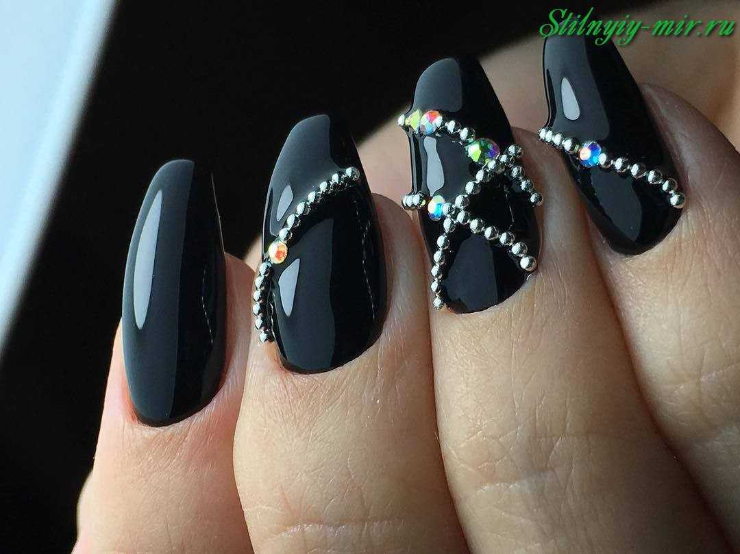 Уже который сезон в моде украшения, сумки и обувь с шипами. Нейл мастера предлагают воплотить популярный тренд на ногтях любой формы и длины. Понадобится темный лак-основа и украшения – конусообразные бусинки или стразы серебристого цвета. С таким дизайном можно пойти на вечеринку или концерт. Жаль, что он живет недолго и требует предельно аккуратного обращения.