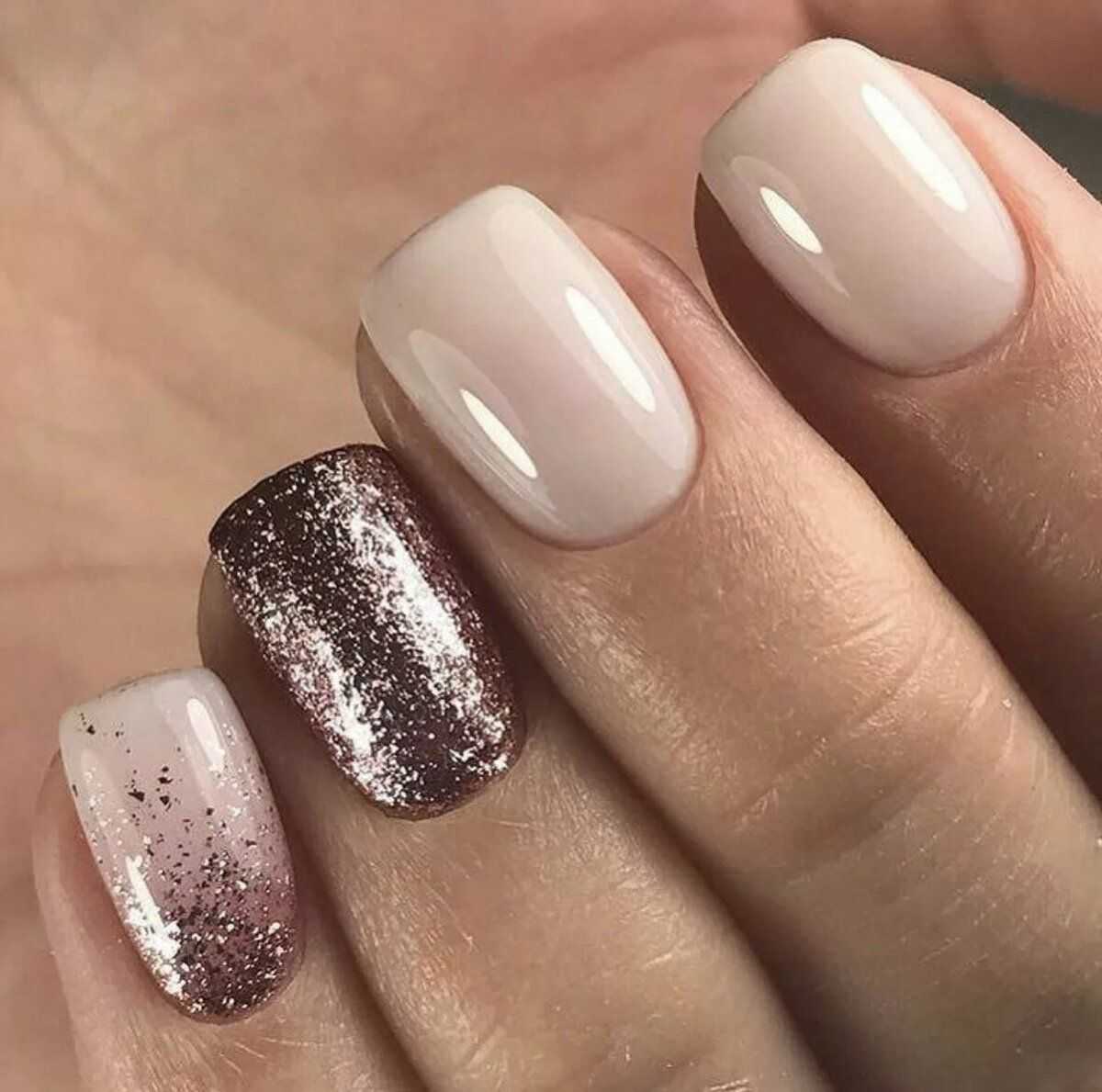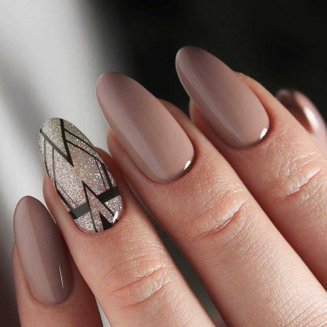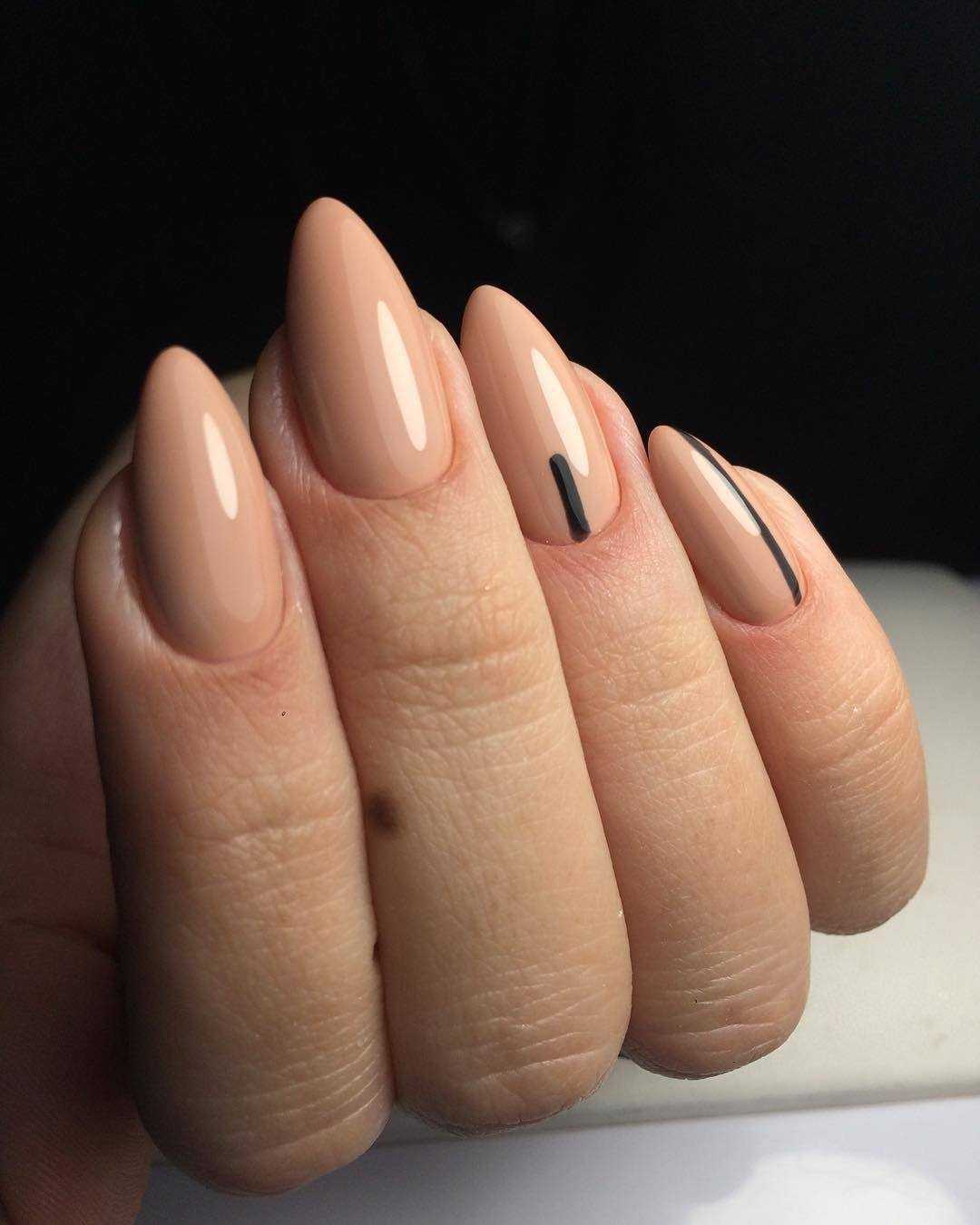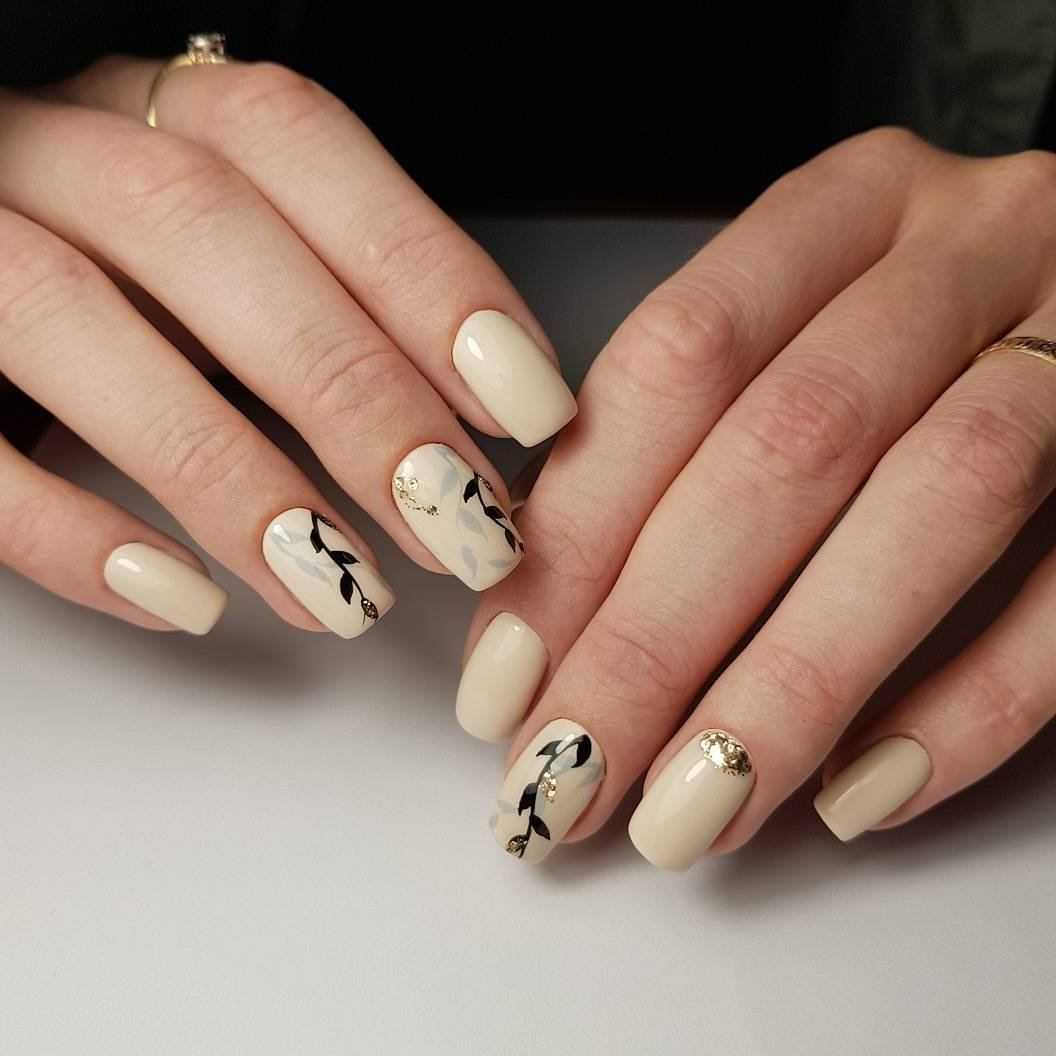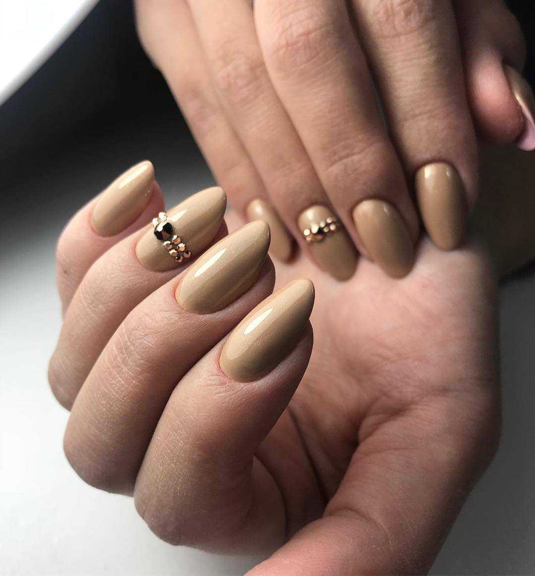 Бежевый окрас — это отличный выбор для обладательниц коротких или квадратных ногтей. При желании его можно украсить геометрическим принтом или небольшим количеством блесток.