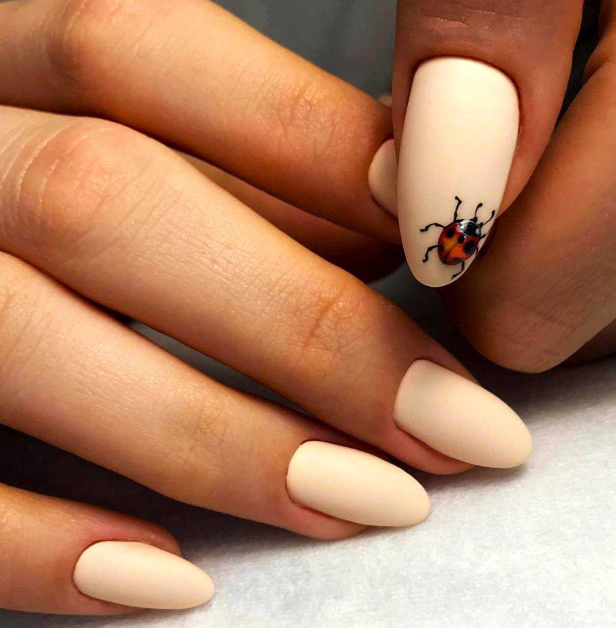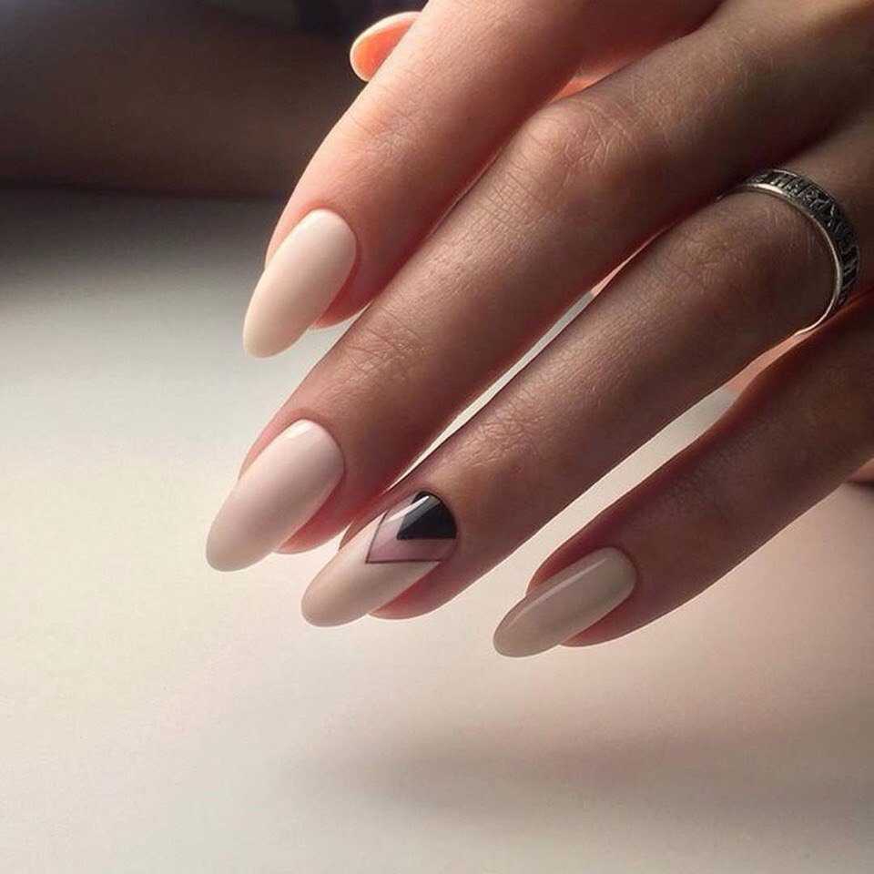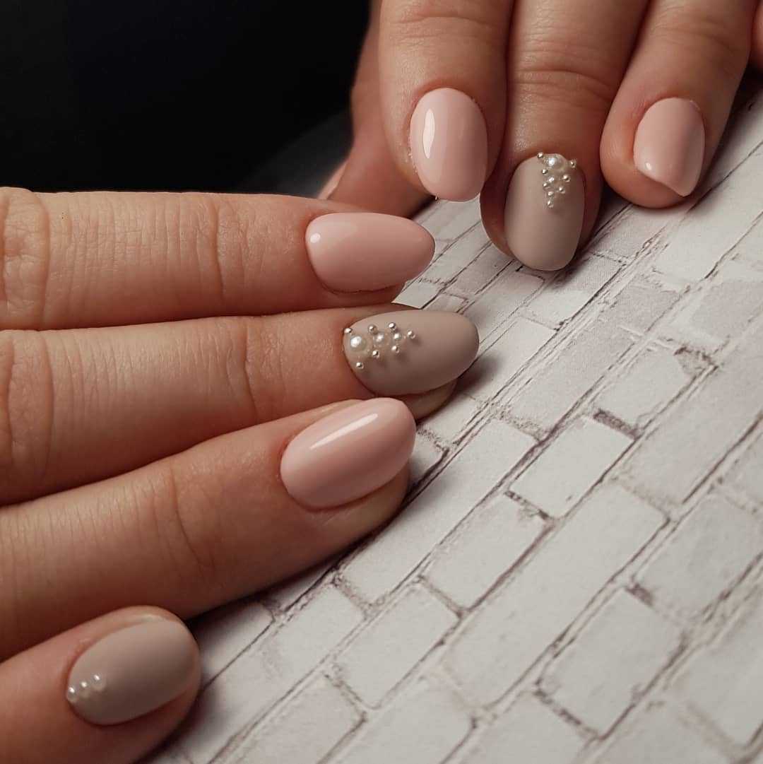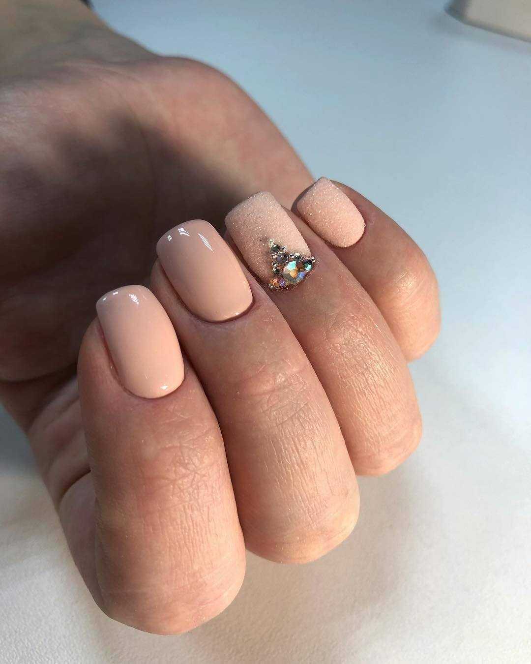 Бежевый окрас — это отличный выбор для обладательниц коротких или квадратных ногтей. При желании его можно украсить геометрическим принтом или небольшим количеством блесток.