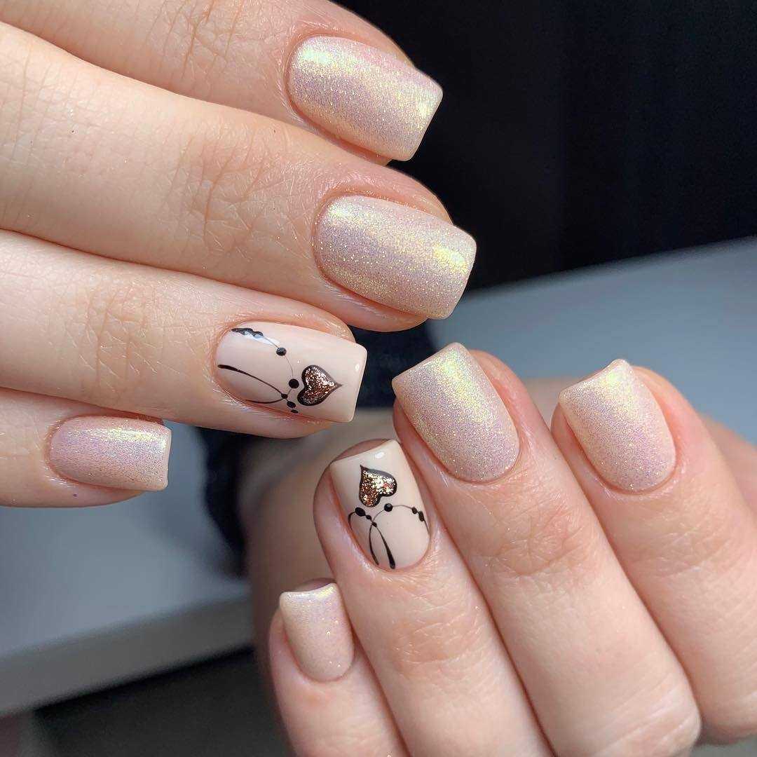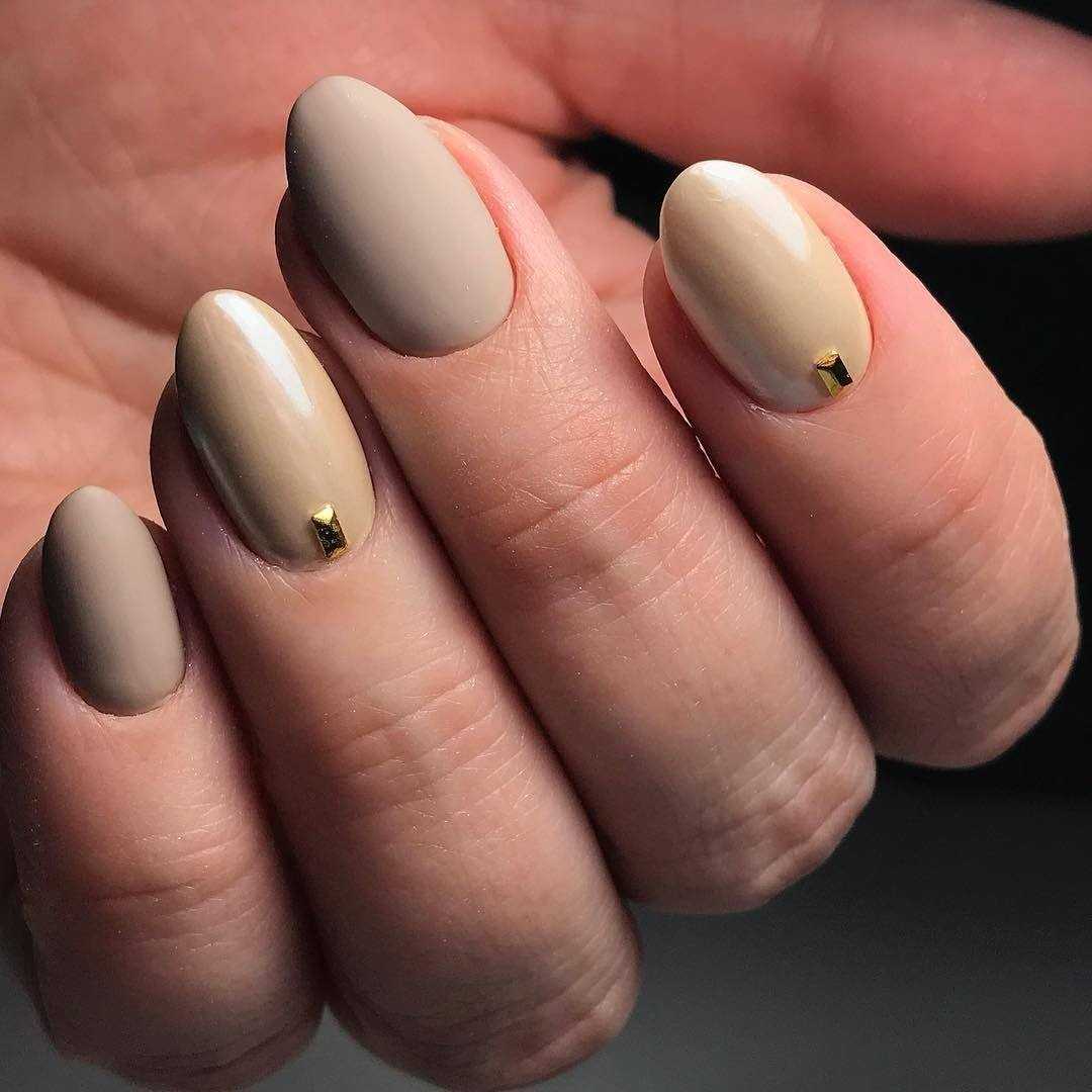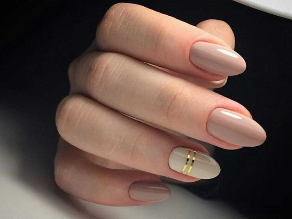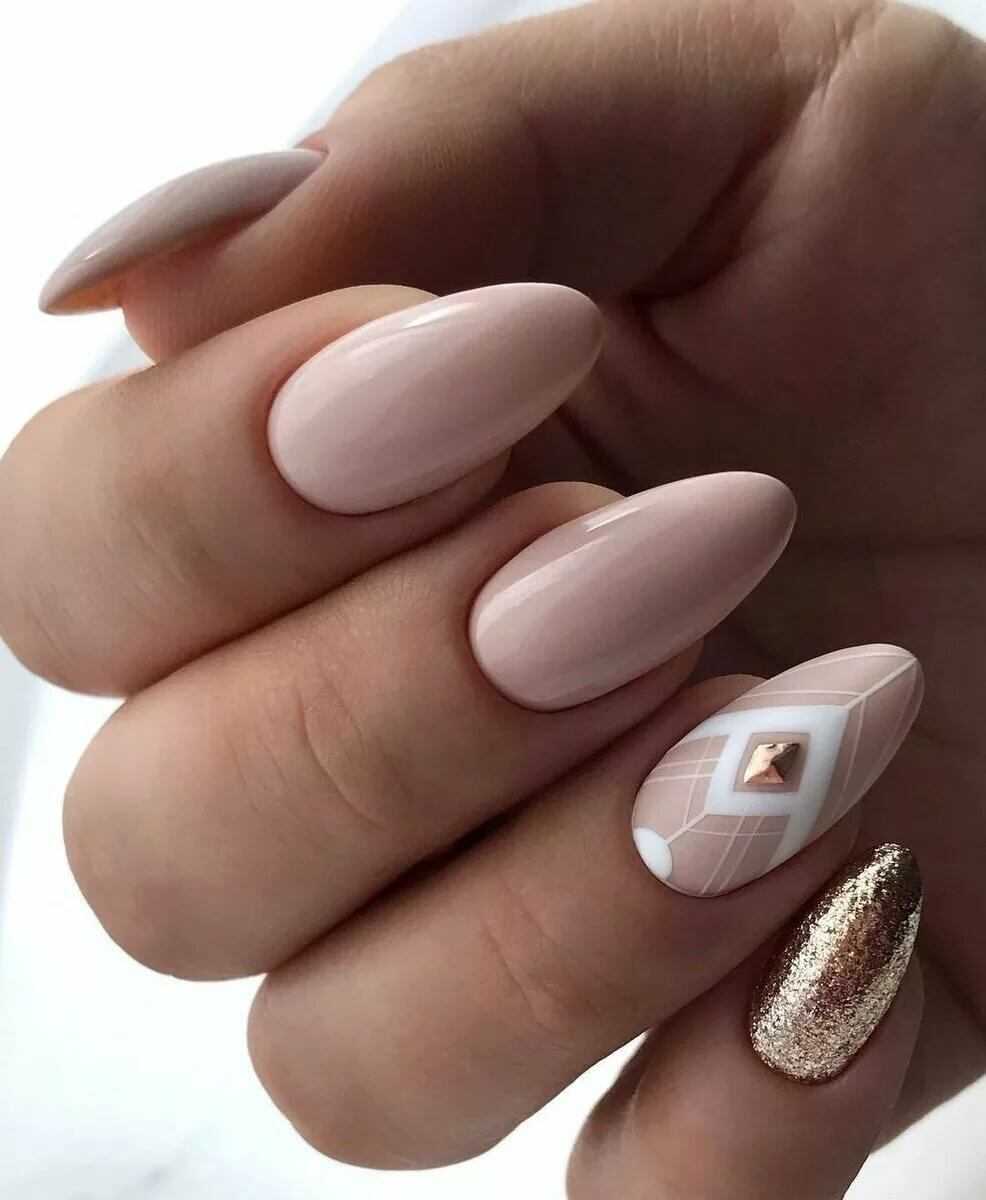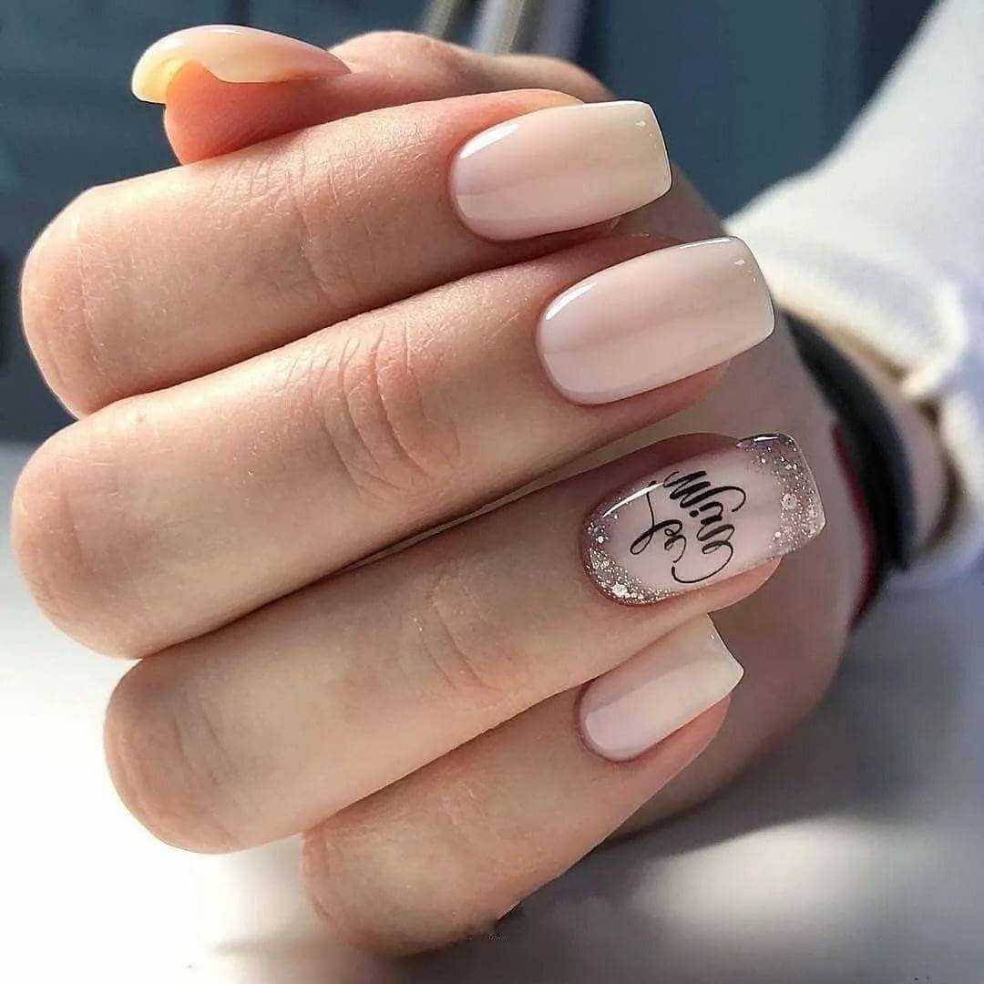 Бежевый окрас — это отличный выбор для обладательниц коротких или квадратных ногтей. При желании его можно украсить геометрическим принтом или небольшим количеством блесток.
