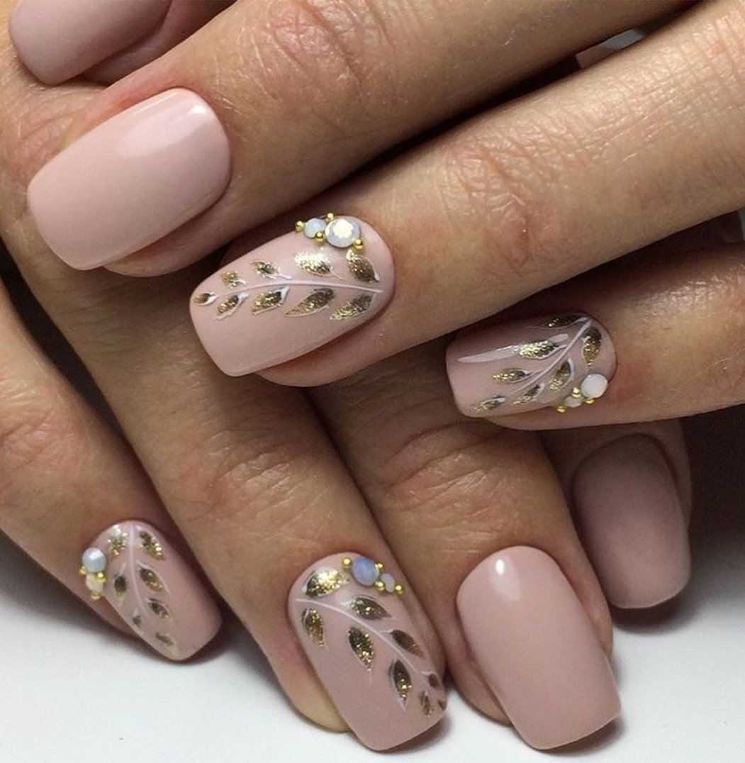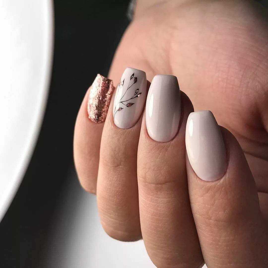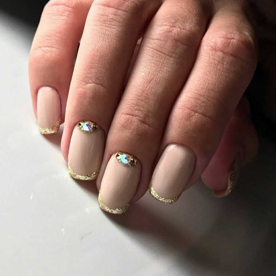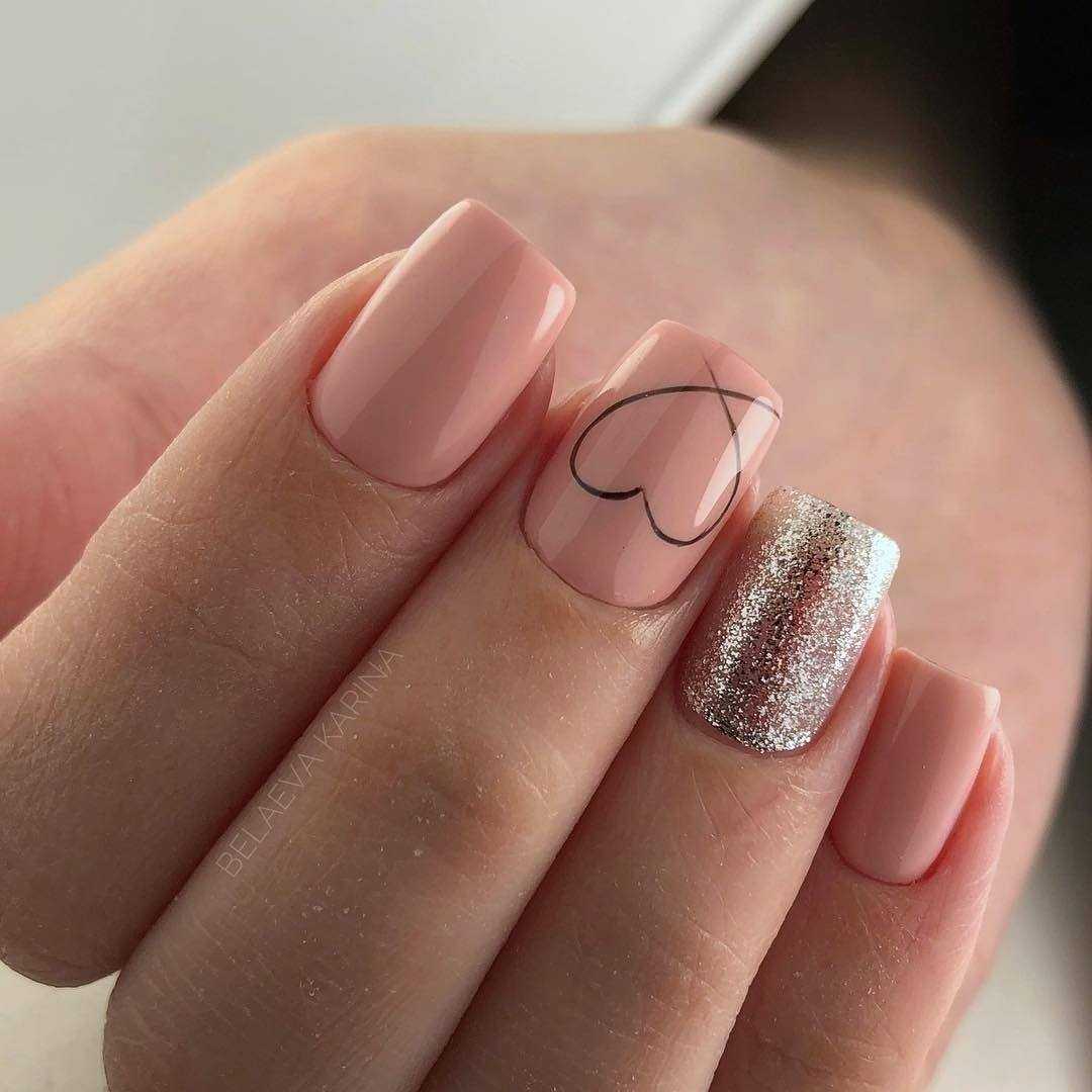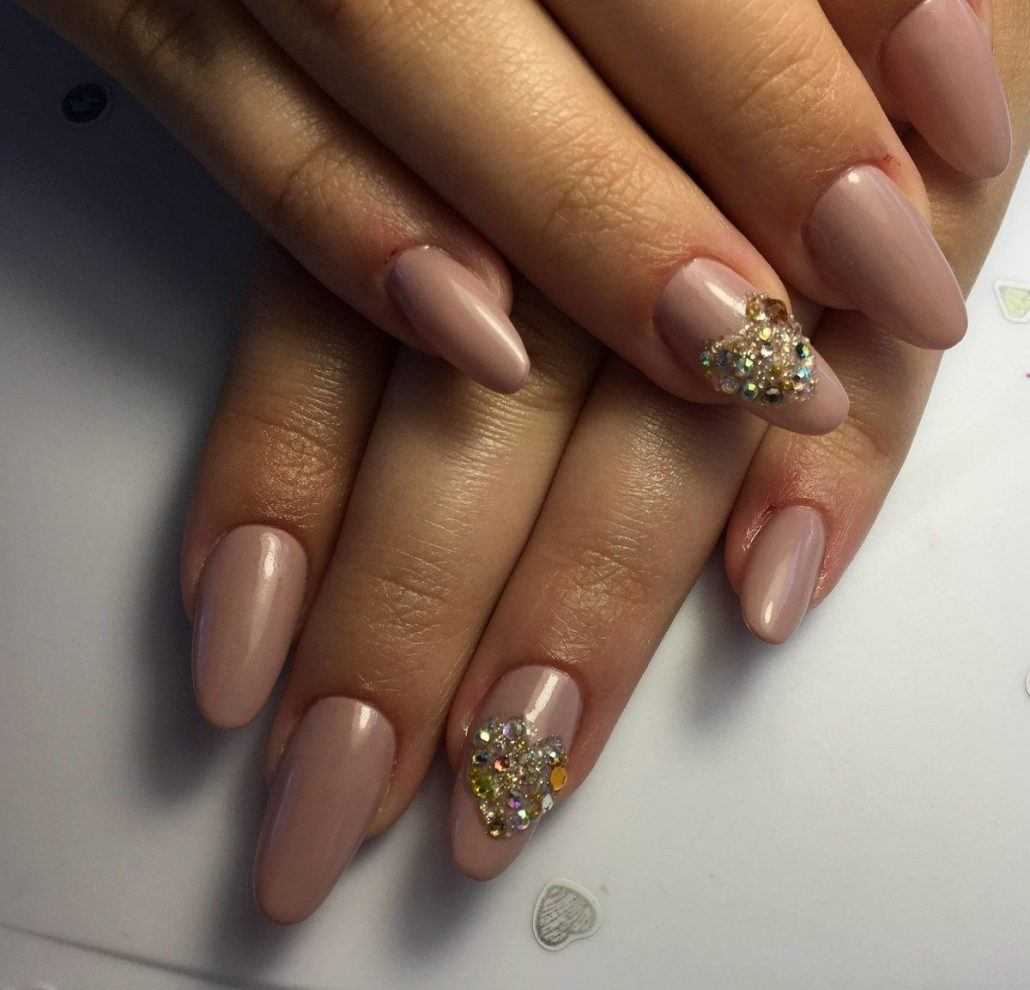 Бежевый окрас — это отличный выбор для обладательниц коротких или квадратных ногтей. При желании его можно украсить геометрическим принтом или небольшим количеством блесток.