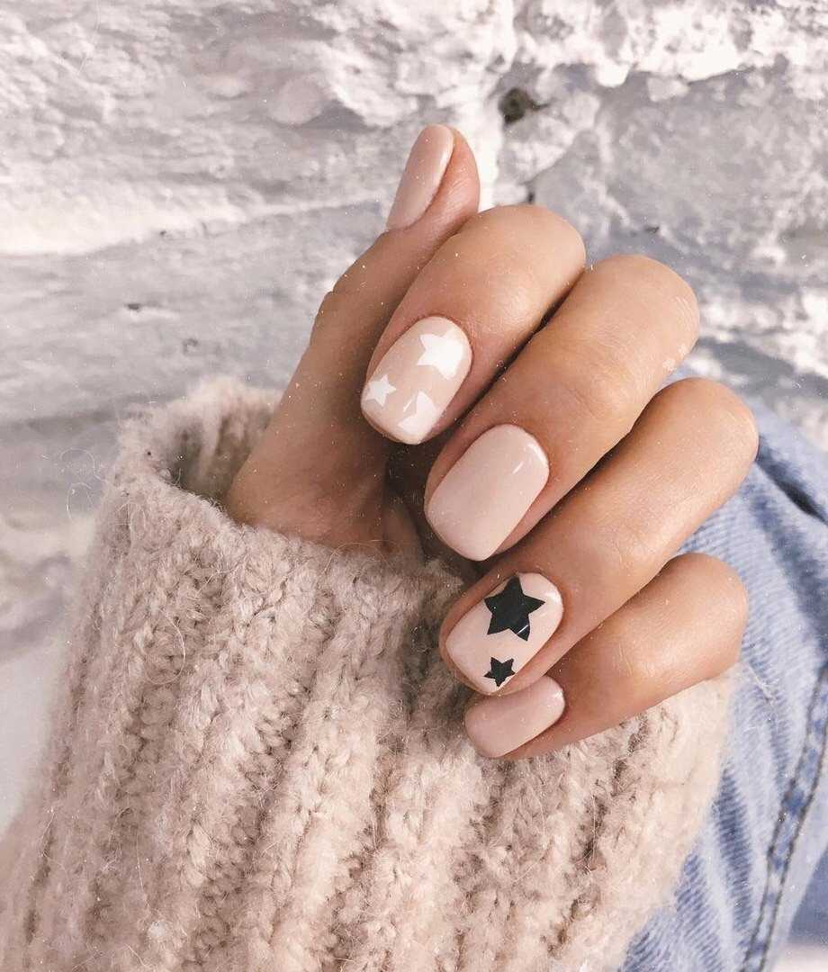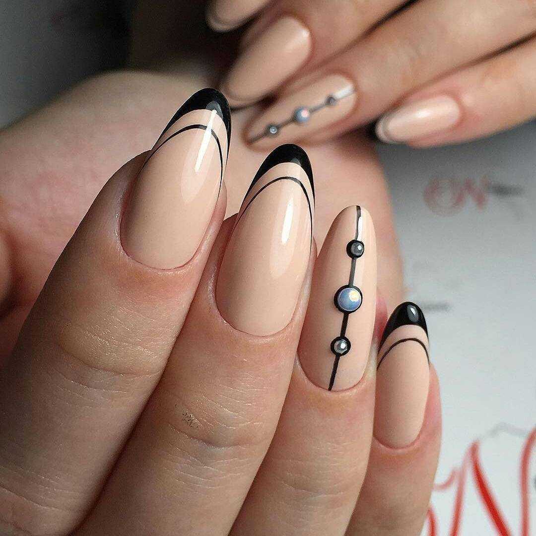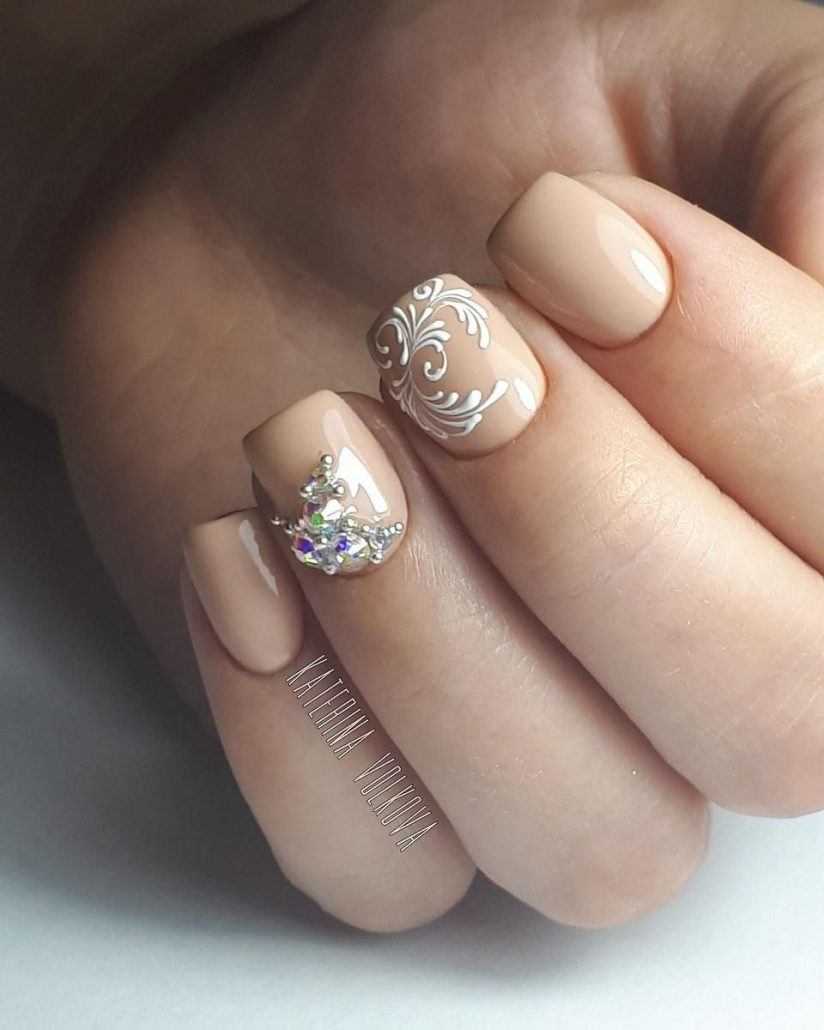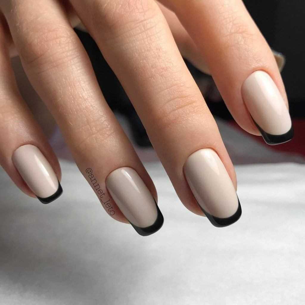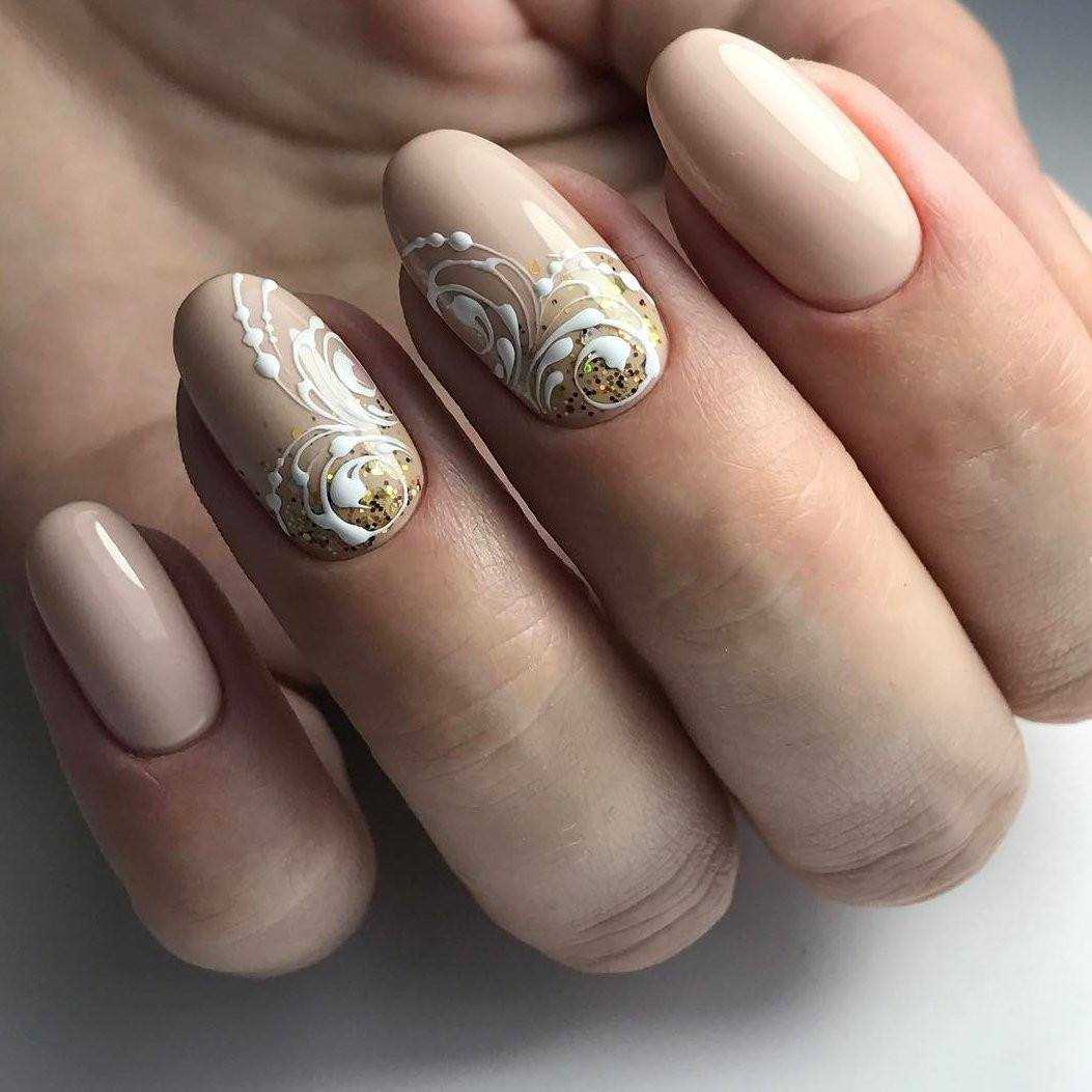 Бежевый окрас — это отличный выбор для обладательниц коротких или квадратных ногтей. При желании его можно украсить геометрическим принтом или небольшим количеством блесток.