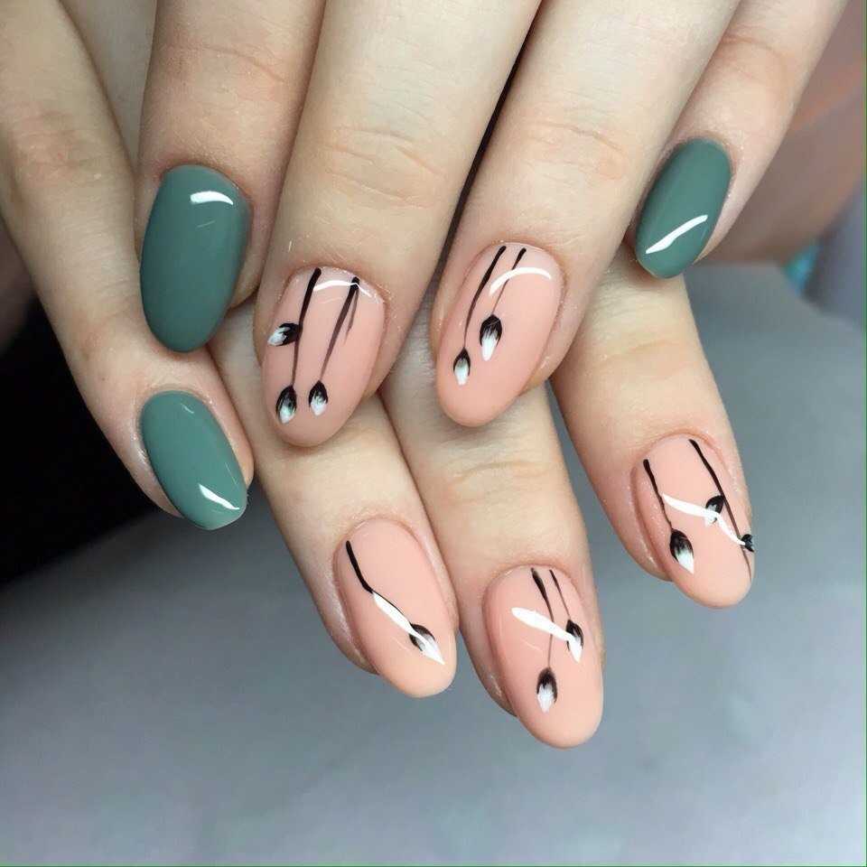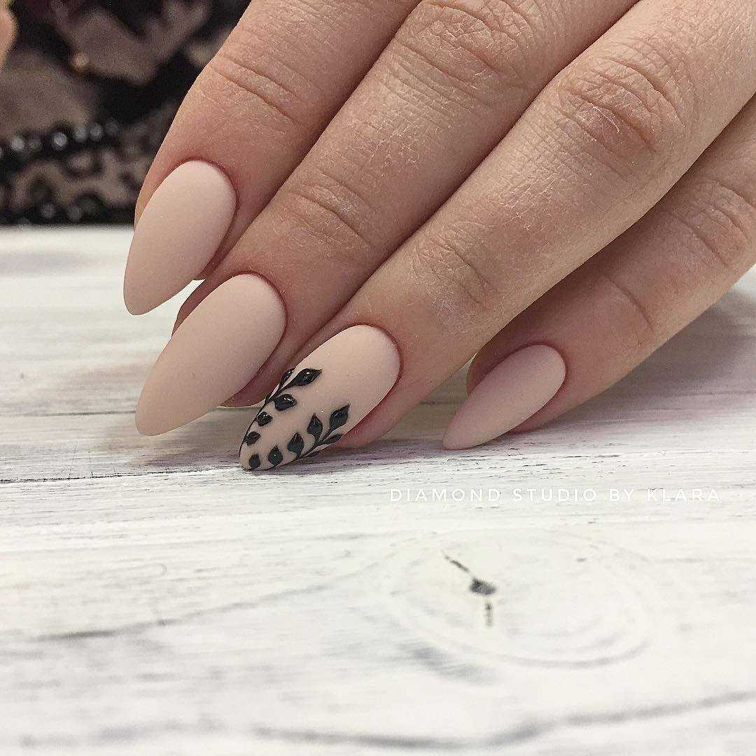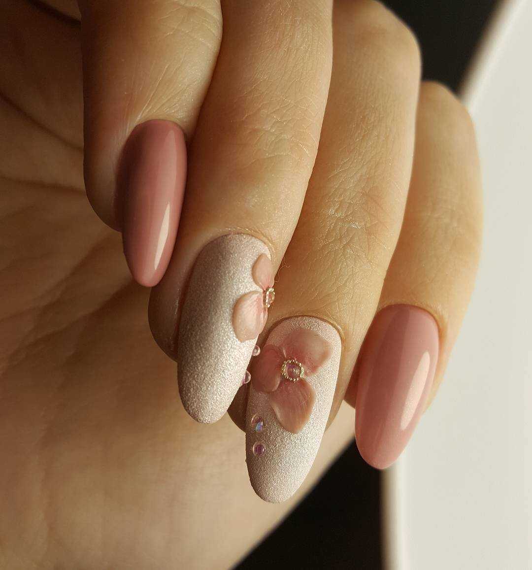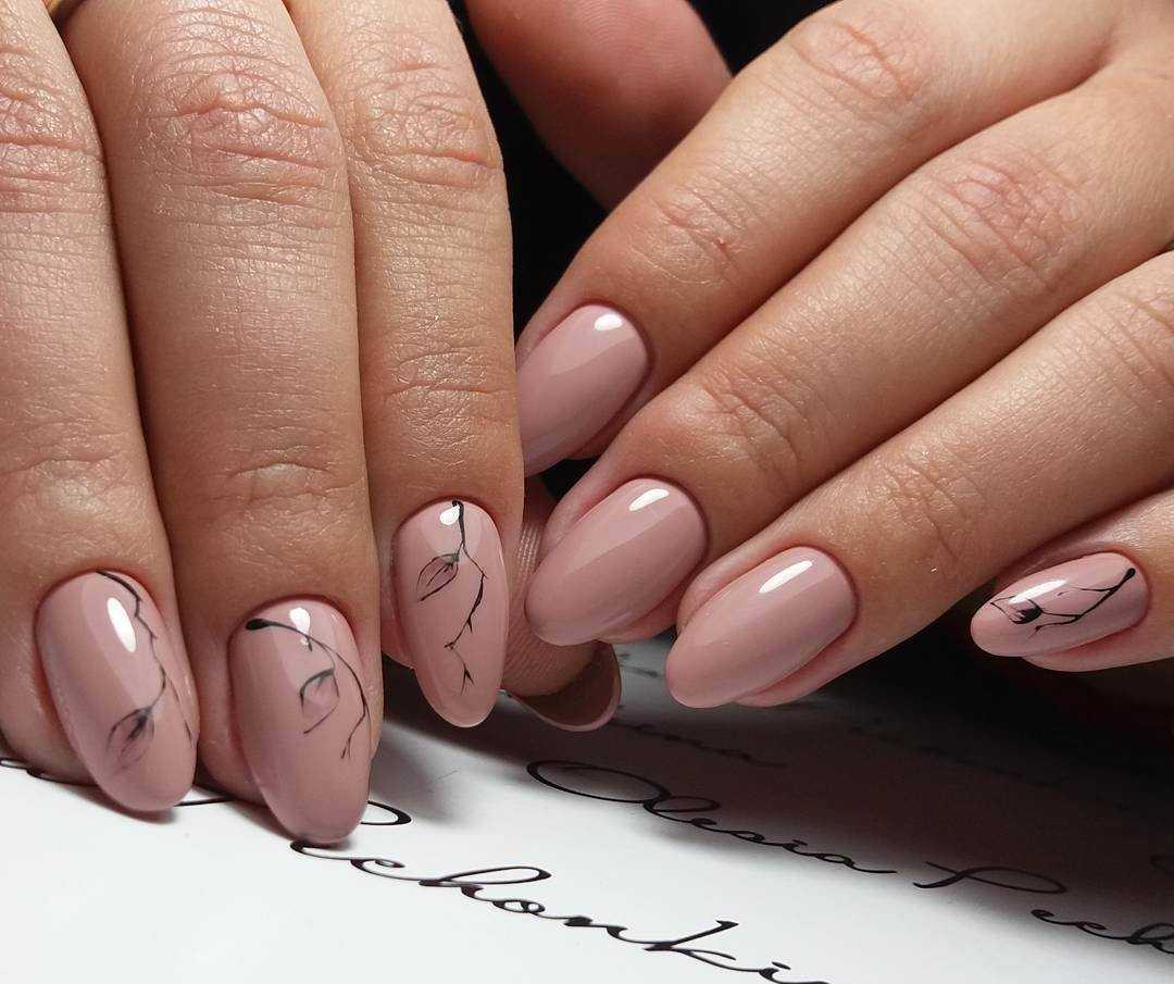 Бежевый маникюр на миндальной форме ногтей с дизайном цветы