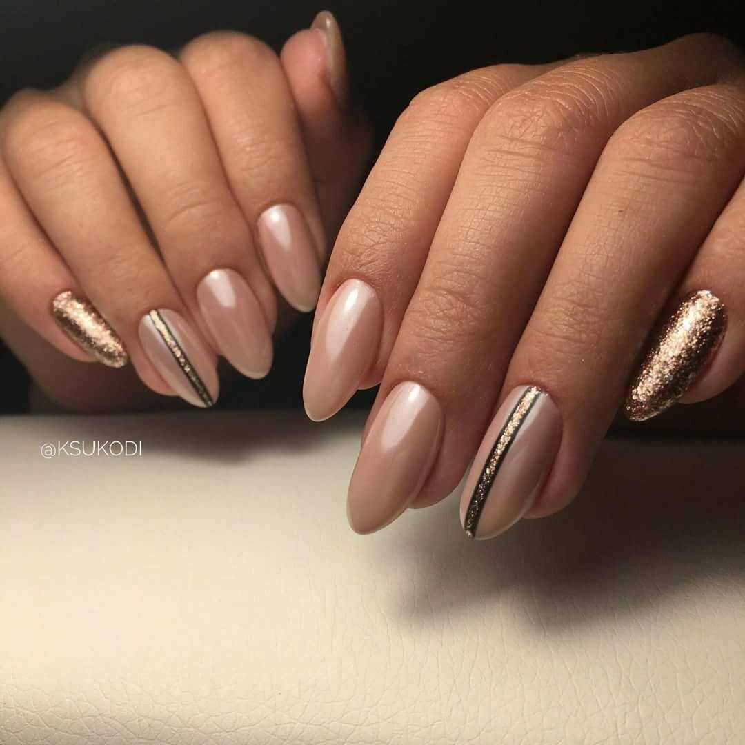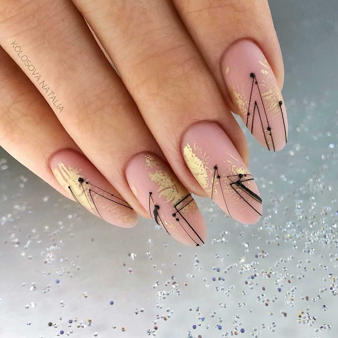 Нюдовый бежевый маникюр с конфети и тонкими линиями на миндальных ногтях