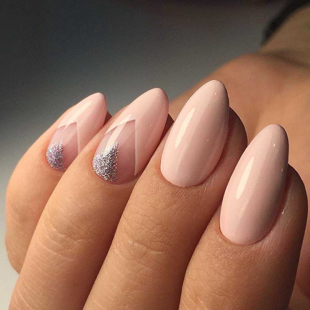 Нежно-розовый маникюр с блестками на двух пальчиках и миндальной формой ногтей