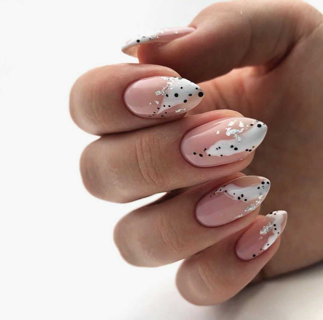 Бело-бежевый маникюр с дизайном разводы на миндальной форме ногтей