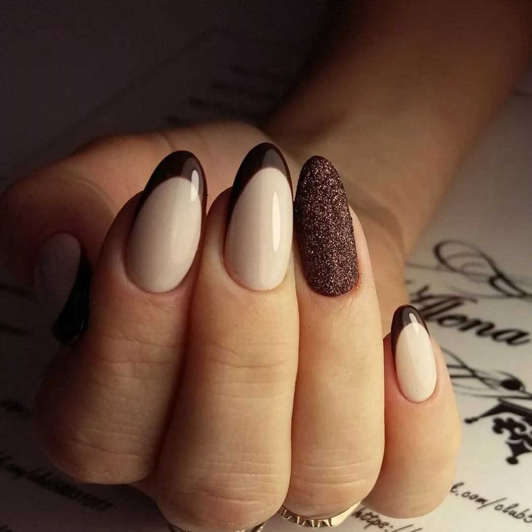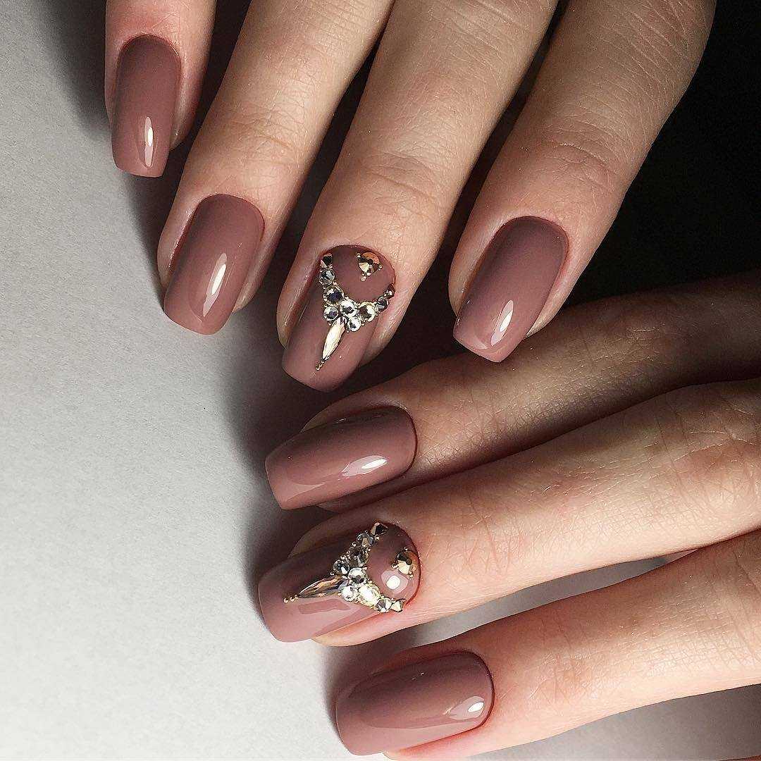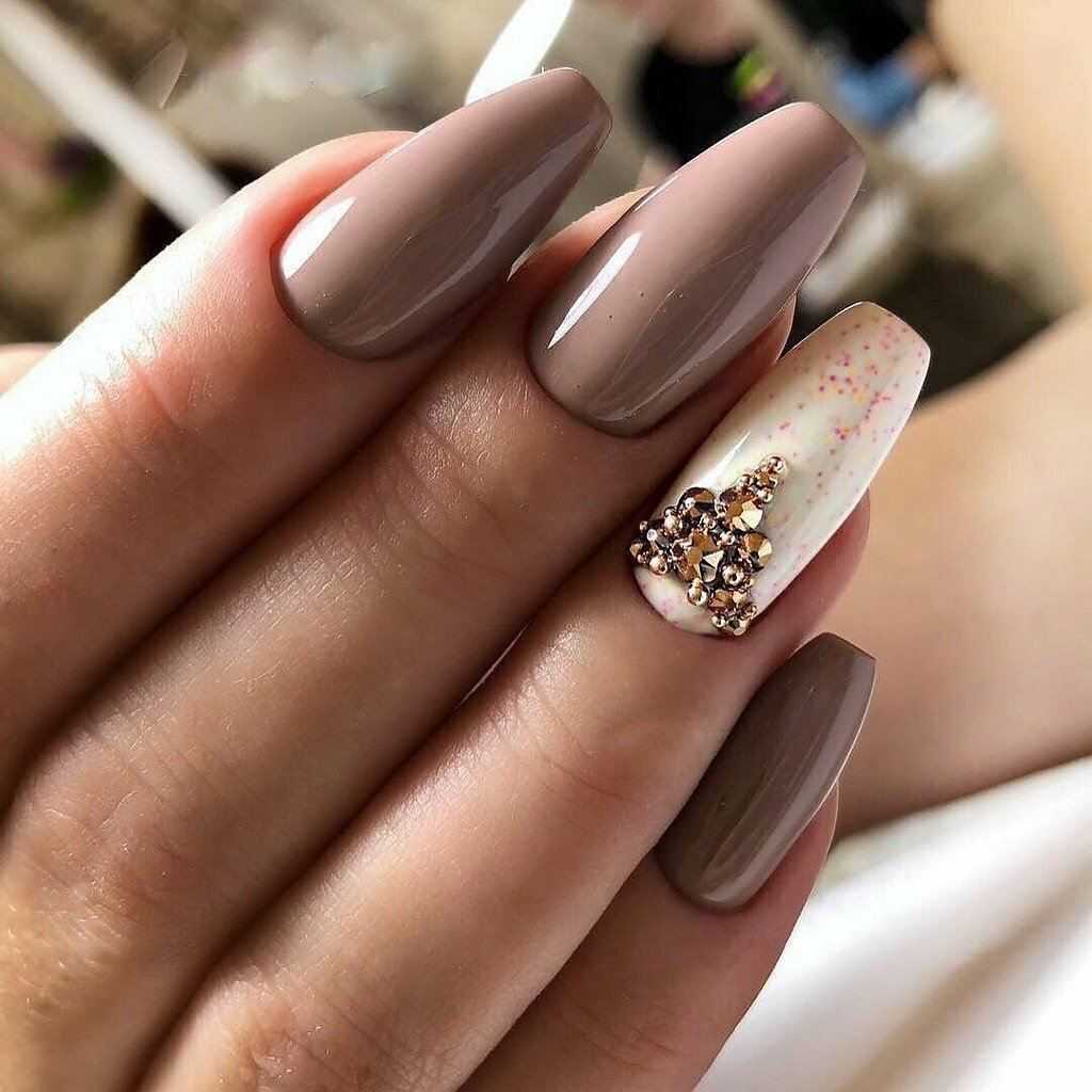 Стразы, блестка или фольга — отличное дополнение для любых оттенков коричневого. Такой маникюр удивит как ваших старых друзей, так и новых знакомых — пользуйтесь этим преимуществом.