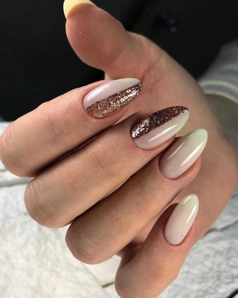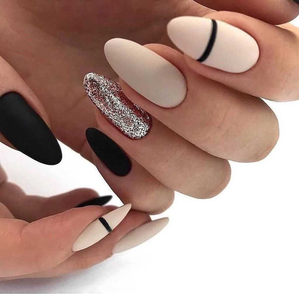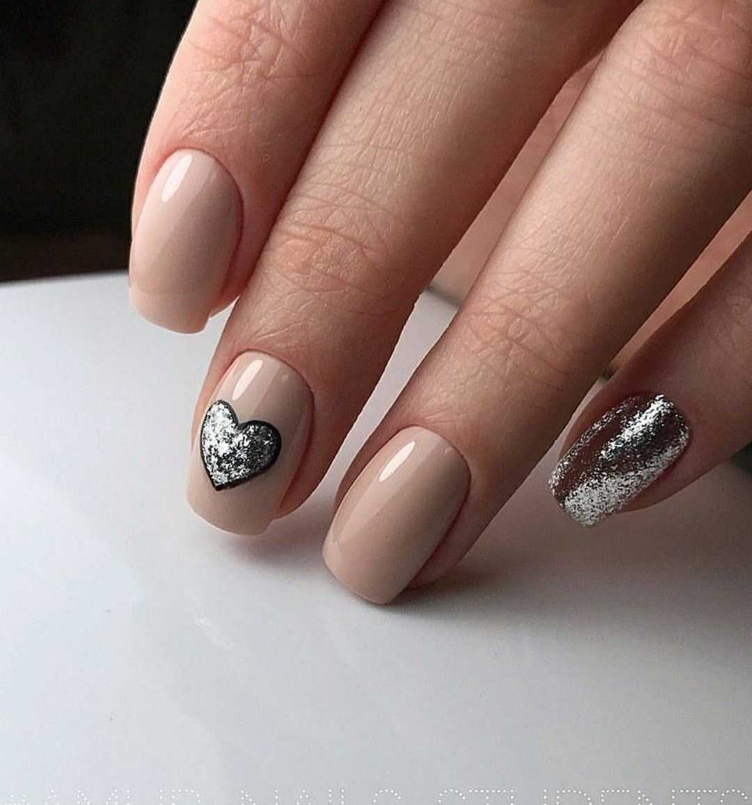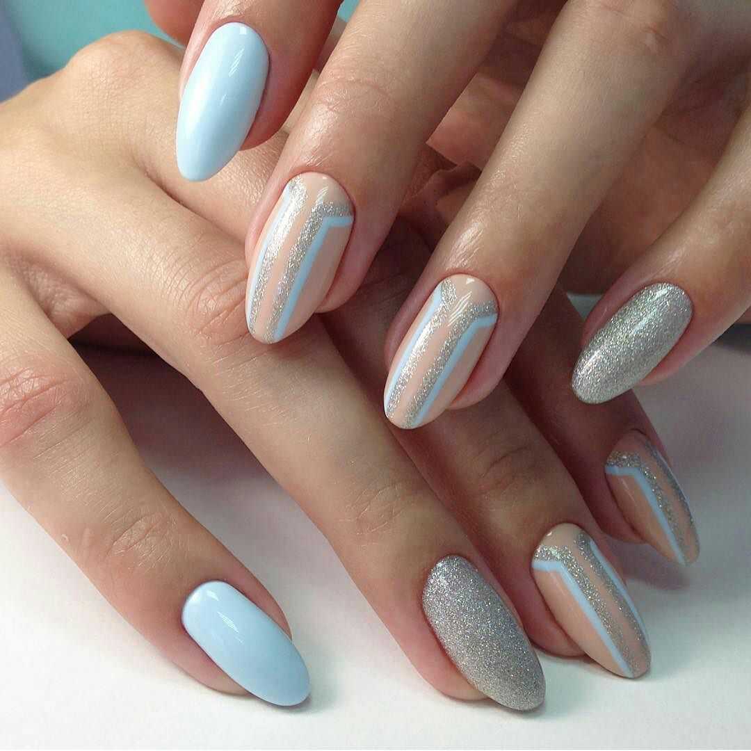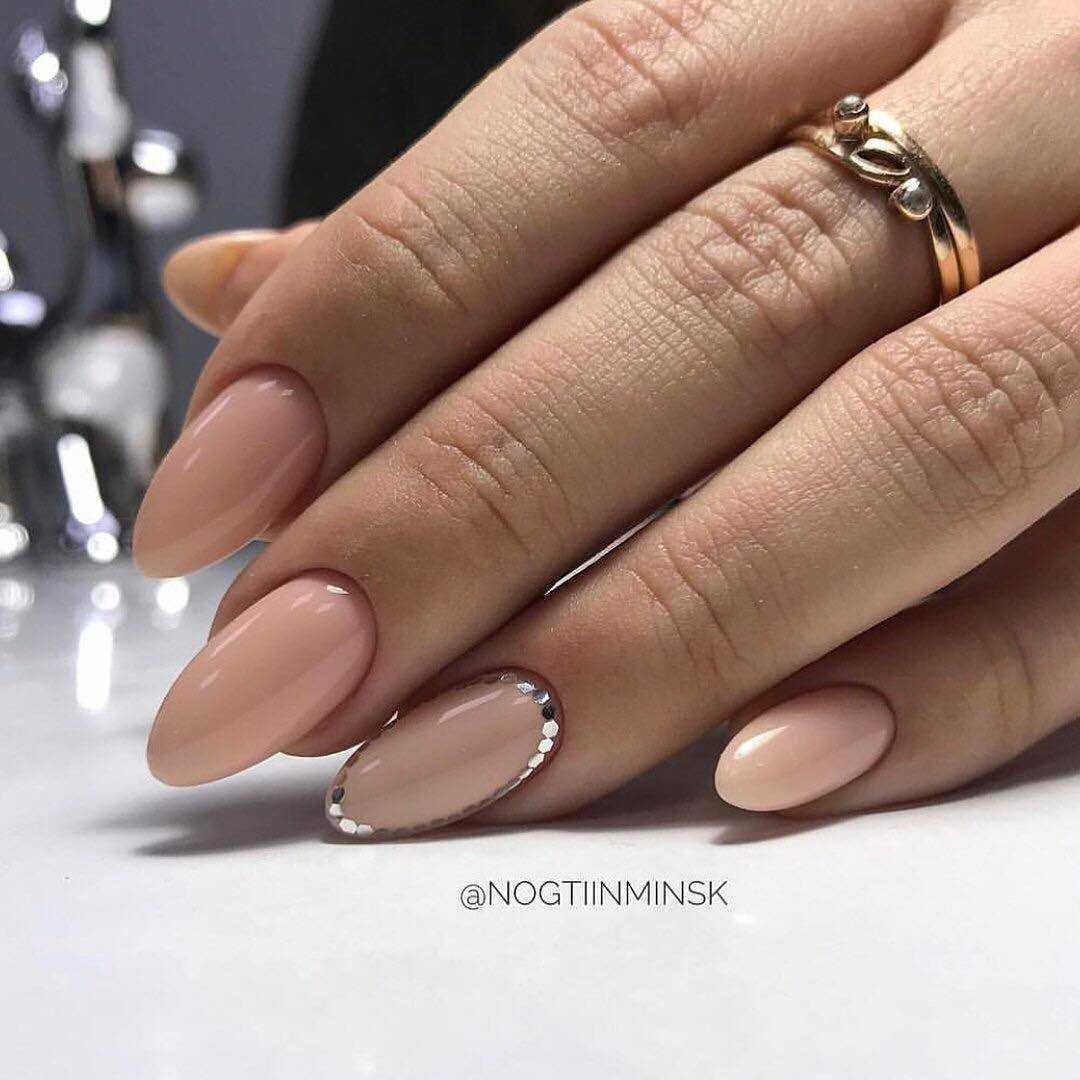 Нюдовый бежевый маникюр с серебром на миндальной форме ногтей