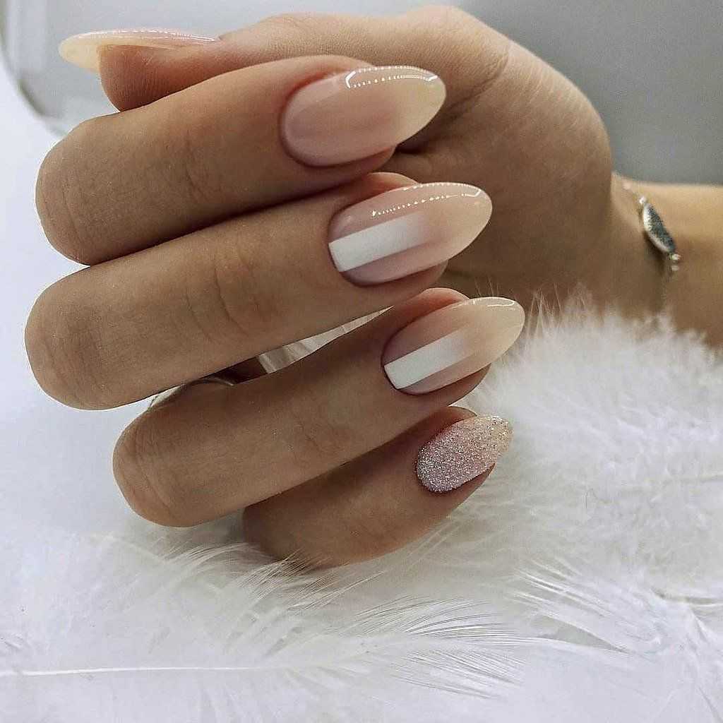 Бежево-белое нюдовое омбре со стразами на миндальной форме ногтей